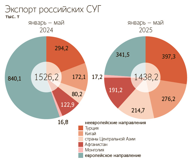 В декабре 2023 г. Евросоюз (ЕС) в рамках 12-го пакета антироссийских санкций запретил импорт СУГ из России в страны сообщества. При этом до декабря 2024 г. действовал переходный период, в течение которого разрешались поставки по заключенным до объявления санкций долгосрочным контрактам. При этом некоторые европейские страны начали самостоятельно сокращать закупки СУГ из России в 2022–2023 гг., когда официального запрета на импорт еще не было.
