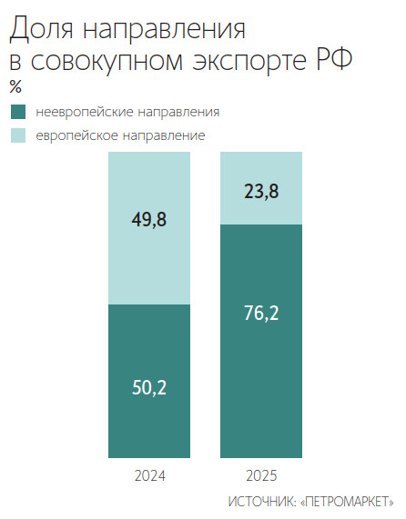 В то же время рост поставок в Азию позволил компенсировать падение экспорта в Европу. Общий экспорт СУГ из России в 2025 г. увеличится на 2% к уровню предыдущего года до 3,9 млн т, свидетельствуют данные «Петромаркета». Доля Европы в общем объеме экспорта снизилась с 50 до 24%, доля Азии увеличилась с 50 до 76%.