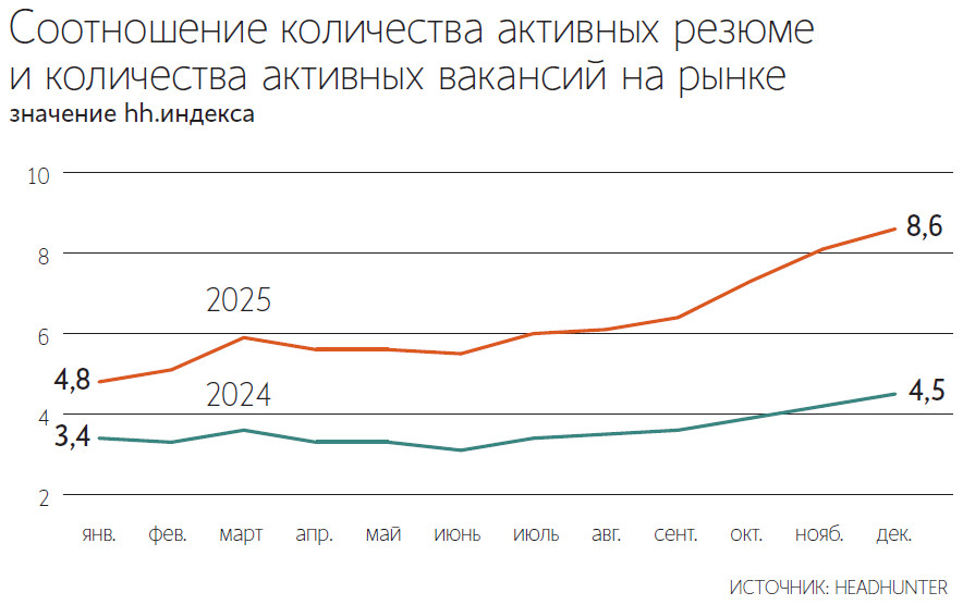На фоне отсутствия массовых увольнений уровень безработицы колебался в прошлом году около исторических минимумов – 2,1%. В начале года показатель был на уровне 2,4%, затем он перешел к снижению. Индекс hh, который показывает отношение количества активных резюме к количеству активных вакансий на рынке, вырос с 4,8 в начале года (умеренный уровень конкуренции за рабочие места) до 8,6 в конце (высокий уровень конкуренции).