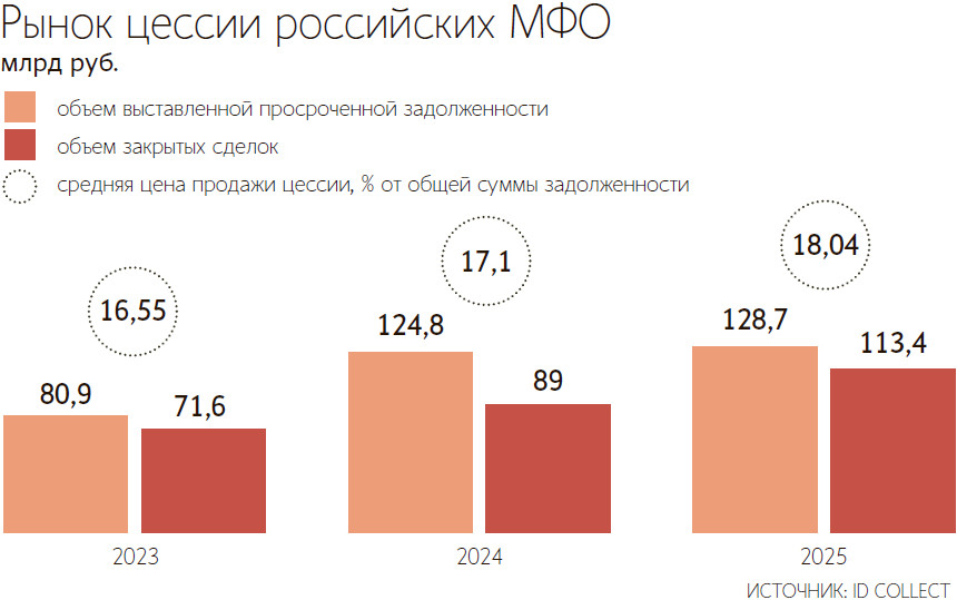 На рынке цессии (переуступка прав требования выплат третьему лицу) 2025 год ознаменовался беспрецедентно высоким интересом покупателей к портфелям МФО, говорит гендиректор ID Collect Александр Васильев. Во многом это связано с тем, что с середины прошлого года из-за роста тарифов на госпошлины спрос смещается в зону досудебных портфелей, поясняет он. Сейчас практически весь объем предложения в сегменте МФО – это «досудебка» с высоким качеством долгов, отмечает Васильев. За прошлый год средний DPD (Days Past Due – средний срок просрочки в днях) по портфелям в закрытых сделках снизился более чем на 15% до 236 дней и этот рост происходил с достаточно низкой базы, указывает он.