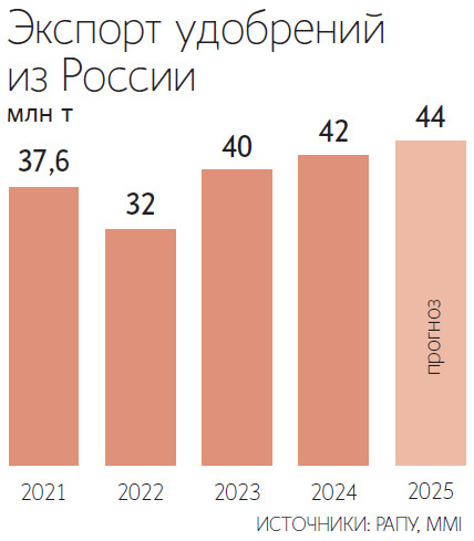 Федеральная таможенная служба России не публикует данные по экспорту удобрений с 2022 г. В 2023 г., согласно статистике РАПУ, поставки за рубеж выросли на четверть в годовом выражении до 40 млн т, а производство – на 9% до 59,3 млн т. На рынки дружественных стран пришлось 75% российского экспорта удобрений в том году.