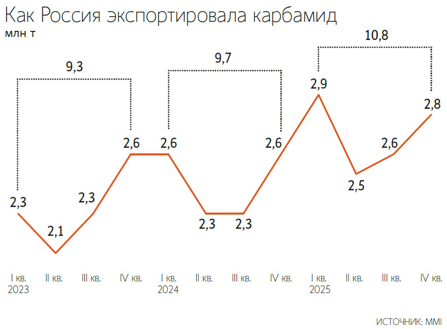 Поставки карбамида, одного из ключевых для России экспортных удобрений, в другие страны в 2025 г. выросли на 11% к уровню предыдущего года до 10,8 млн т. Это следует из статистических данных агентства Metals & Mining Intelligence (MMI), с которыми ознакомились «Ведомости». В IV квартале прошлого года экспорт карбамида за рубеж составил 2,8 млн т (+8% в годовом выражении). Наибольший объем экспорта этого вида азотных удобрений в прошлом году был в I квартале – 2,9 млн т (+12% год к году).