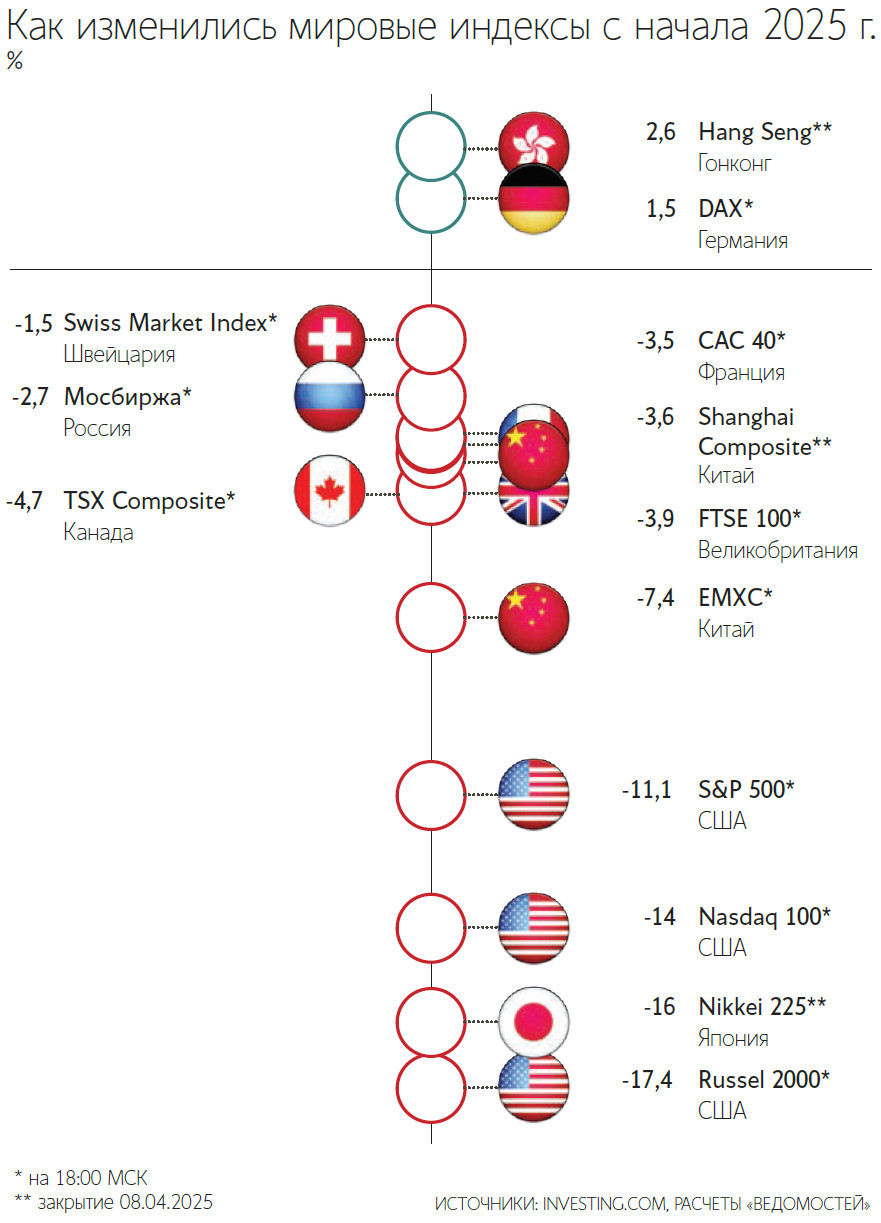 Другие мировые рынки во вторник тоже перешли к коррекции после снижения, начавшегося 3 апреля из-за введения пошлин Дональдом Трампом. Вечером по Москве европейские индексы показывали рост на 2–2,7%, американские – на 1,3–2,6%. В Азии главный гонконгский индекс Hang Seng закрылся ростом на 1,51% после исторического обвала на 13% днем ранее, индекс материкового Китая CSI300 – на 1,71%, японский Nikkei 225 – на 6,01%, корейский KOSPI – на 0,26%.