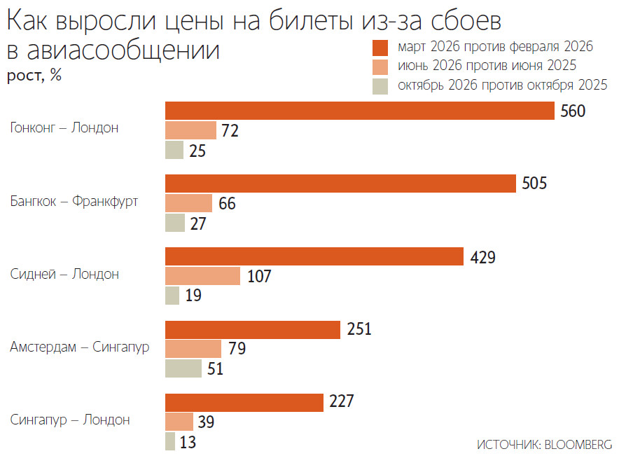 По подсчетам AAC, по состоянию на 23 марта на 560% до $3318 выросла по сравнению с предыдущим месяцем средняя стоимость авиабилетов на рейсы из Гонконга в лондонский аэропорт Хитроу. За тот же период до $2870 (рост на 505%) выросли цены на билеты из Бангкока во Франкфурт. В среднем, по прогнозам аналитиков, стоимость перелета по ключевым маршрутам из Азиатско-Тихоокеанского региона в Европу в июне будет примерно на 70% выше, чем в аналогичное время 2025 г. Больше всего подорожают рейсы из Сиднея в Лондон – с $725 в июне 2025 г. более чем до $1500 этим летом. Эти цифры включают как прямые рейсы, так и рейсы с одной пересадкой, в том числе транзитные рейсы через узловые аэропорты Персидского залива.