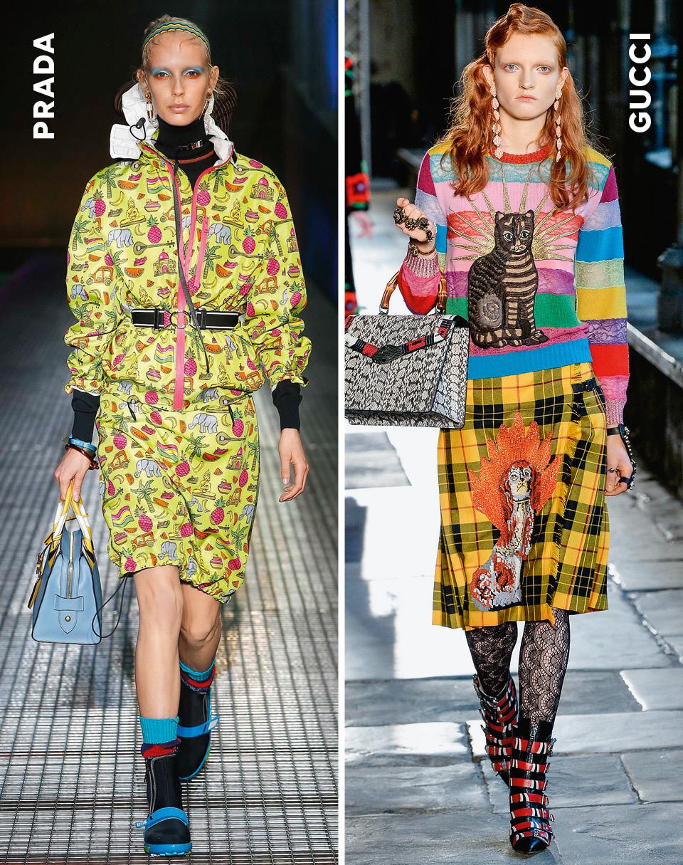 Вот расписные ботинки на оглушительной платформе из коллекции Marc Jacobs весна–лето 2017: у щиколотки изображен пистолет, платформу обнимают тонкие женские пальцы с алым маникюром, у каблука притаилась зеленая жаба в короне — такие точно могли бы участвовать в показе Андрея Бартенева, первого московского, как тогда говорили, авангардного модельера, который в 1995 году выпускал на подиумы казино и первых ночных клубов безумные конструкции из папье‑маше. Теперь художественные критики