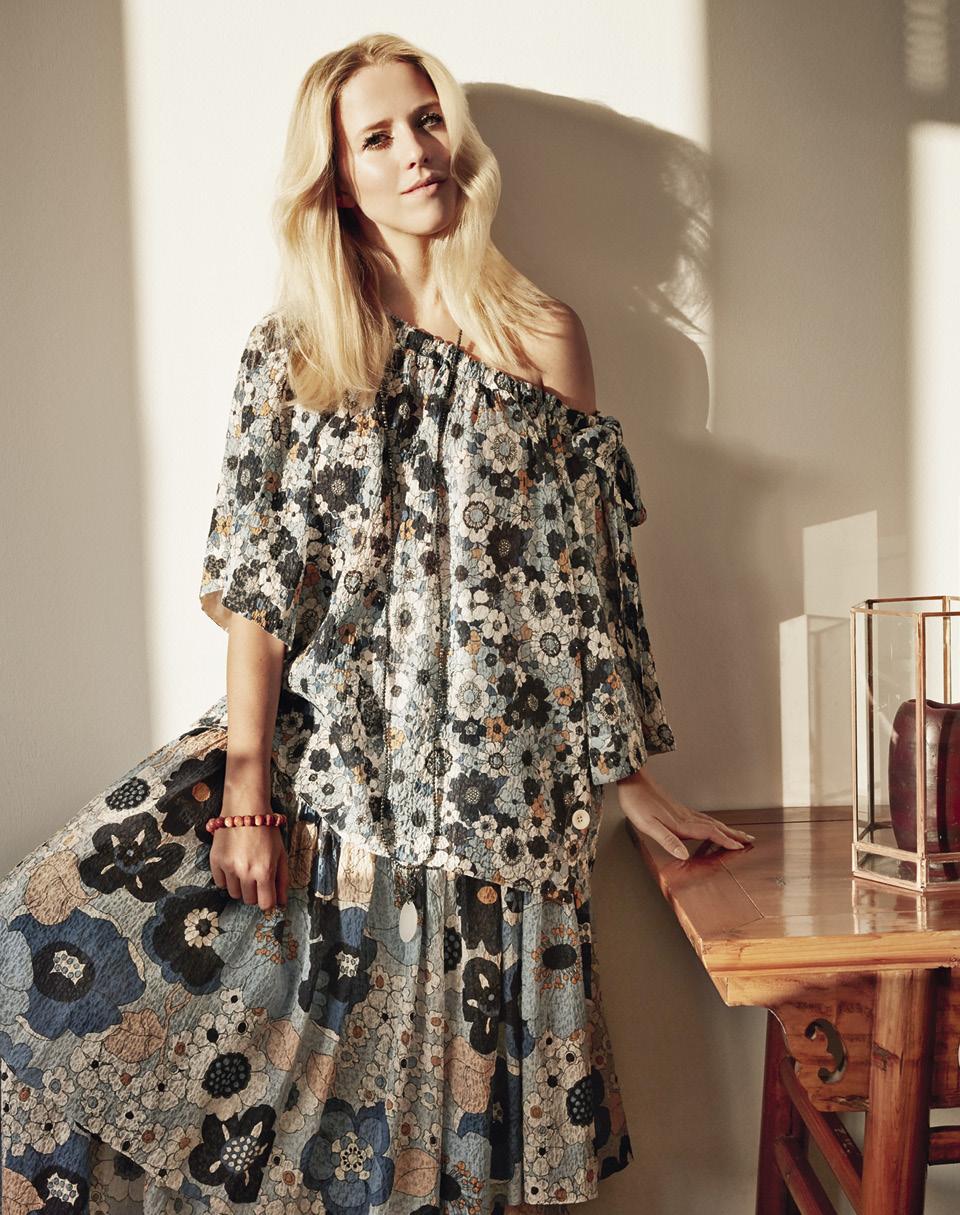 Хлоп­ко­вые блуз­ка и юбка, все Chloé; ко­лье, 5 520 руб., и брас­лет, 4 720 руб., из би­се­ра, все Marc Cain.