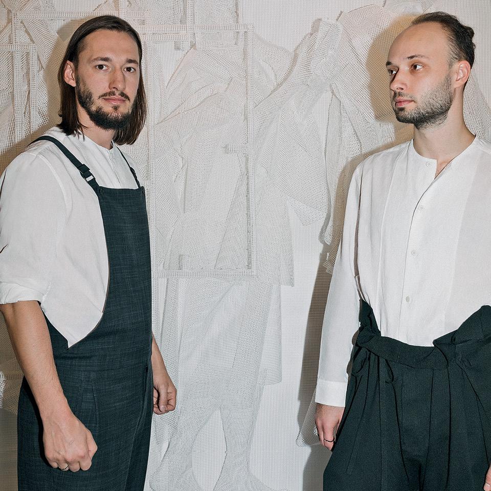 Геор­гий Кузне­цов и Андрей Блохин на фоне сво­ей ра­бо­ты «Без на­зва­ния», пла­сти­ко­вая сет­ка, 2017. На ху­дож­ни­ках: ру­баш­ки, ком­би­не­зо­ны, все Issey Miyake.