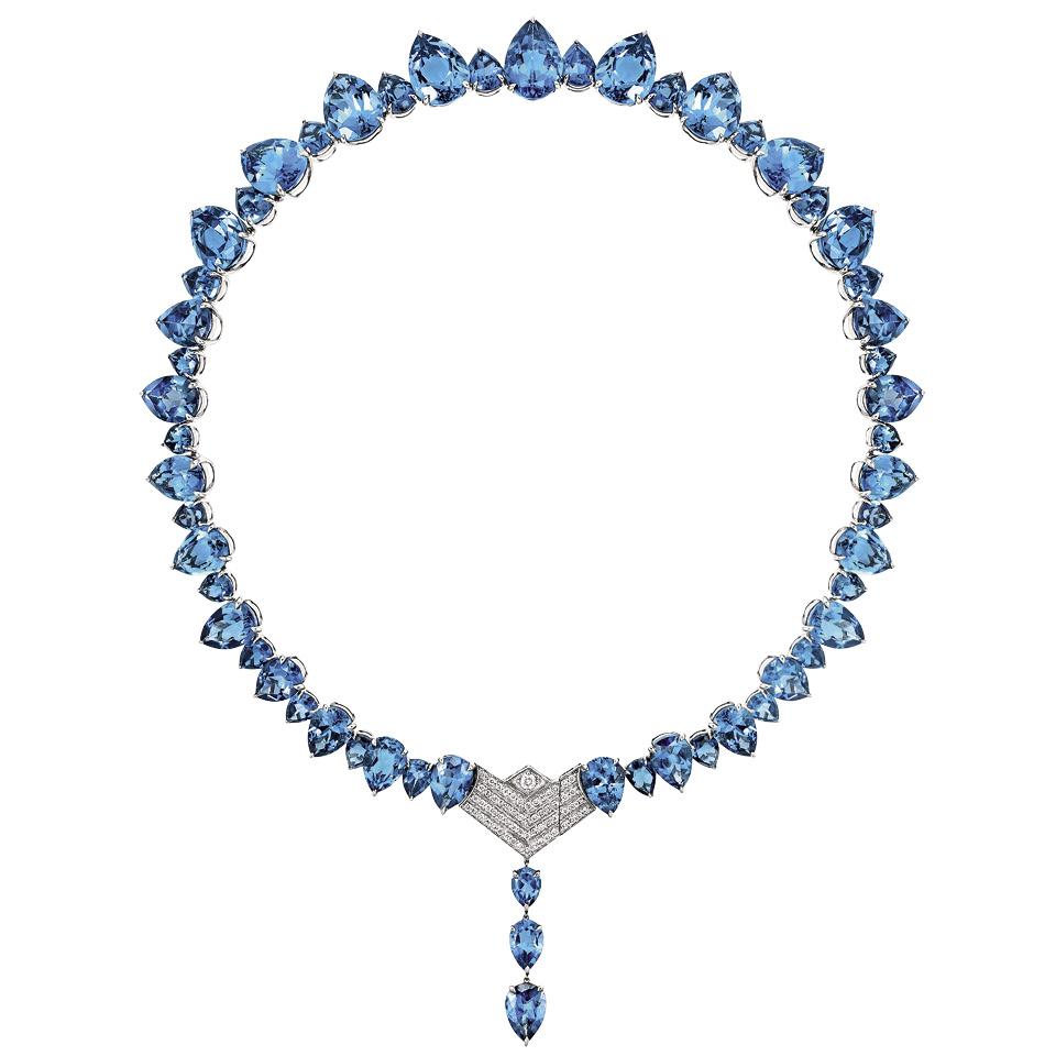 Московский ювелир Яна Расковалова представила украшения с цветными камнями. Звезда коллекции — колье «Капли» из белого золота с ярко-синими топазами грушевидной огранки и бриллиантовой застежкой, которую можно носить и на спине, и на груди.