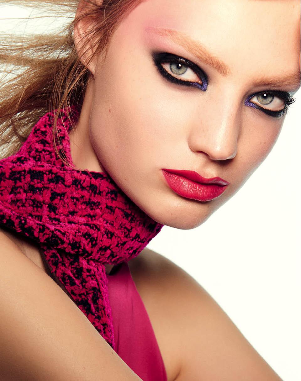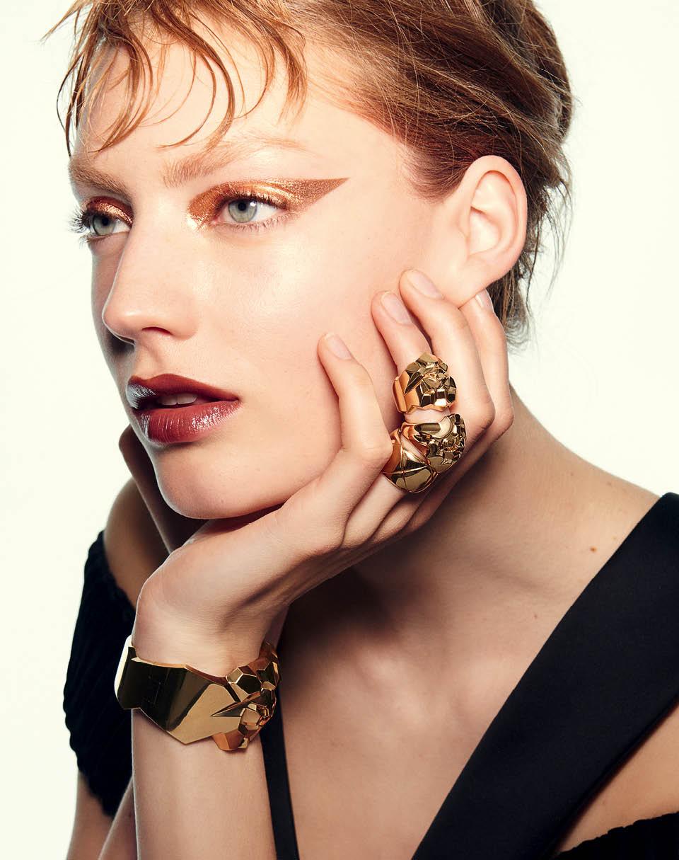 Тональный флюид Fusion INK, B20; хайлайтер Touche Éclat, 2; Румяна Baby Doll Kiss & Blush, 12; тушь для бровей Couture, 2; карандаш для глаз Couture Kajal, 1; тени Couture Mono, 8; Тушь Effet Faux Cils, 1; Помада Rouge Pur Couture, 1, Все Yves Saint Laurent. Твидовый шарф, Chanel.Тональный флюид Les Beiges, 10; пудра Les Beiges Helthy Glow, Duo 02; тени Empreinte du Désert, 2G; тушь Dimensions de Chanel, 10; помада Rouge Coco Stylo, 214; лак для ногтей Le Top Coat, все Chanel. Шелковый топ, Vionnet; золотые кольца Lion, Coco Crush, кольцо и браслет Arty Lion, все Chanel Fine Jewelry.Тональный флюид Miracle Cushion, 010; пудра Belle De Teint, 03; карандаш для бровей Sourcil Pro, 010; тени Hypnôse Drama, DR2; подводка и тушь Grandiôse, 01; помада Rouge in Love, 277, все Lancôme. Шелковый топ, Chromat; часы Serpenti из стали и розового золота с бриллиантами, Bvlgari.