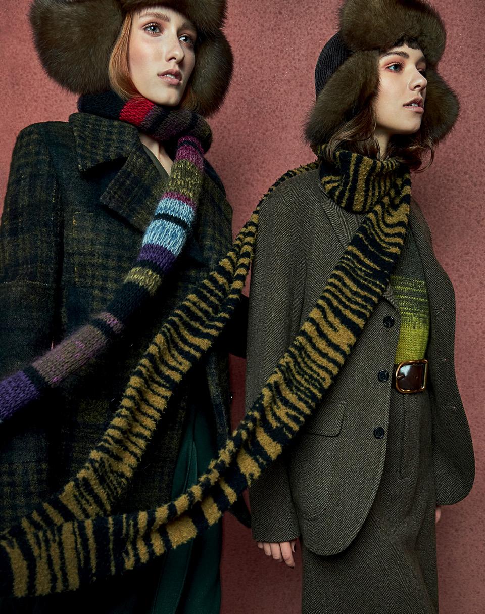 Шерстяные жакет, 190 000 руб., и юбка, 87 450 руб., кожаный ремень, 25 000 руб., все Ralph Lauren; шерстяной пуловер, 47 000 руб., Bottega Veneta; шапка из меха соболя и стриженого меха бобра, 63 000 руб., Blackglama; шерстяной шарф, Roberto Cavalli.