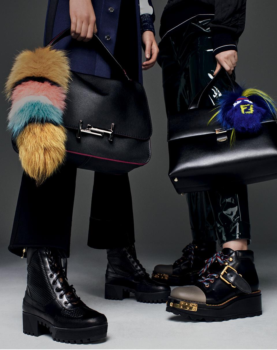 Шелковый топ, Chloe, брюки из полистера, 40 000 руб., Carven. кожаная сумка, Giorgio Armani; брелок Fendirumi из меха лисы, норки и козы, Fendi; кожаные ботинки, Prada.