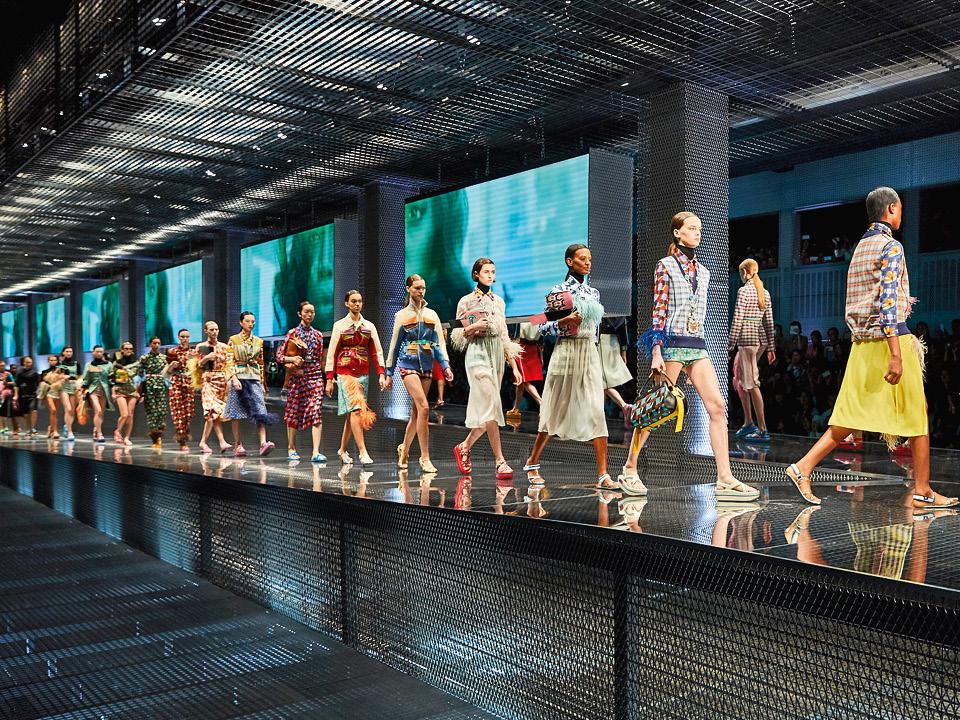 На показе весенне-летней коллекции Prada весь первый ряд смотрел скорее не на подиум, а на огромные экраны над ним — столь завораживающе прекрасны были кадры из фильма трехкратного номинанта на «Оскара», режиссера Дэвида О. Расселла Past Forward, «Вперед в прошлое», снятого по заказу Миуччи Прады. Черно-белая съемка, крупные планы, авангардный монтаж превратили будничные события вроде похода героини к врачу и пограничного досмотра в сцены из триллера. Временами казалось, будто девушке на экране и правда что-то угрожает!
