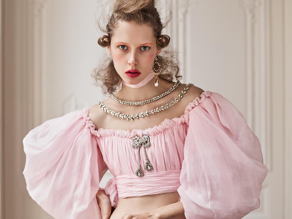 Блузка из шелка и тюля с колье и брошью из металла и стразов, Giambattista Valli Haute Couture; серьга с искусственным жемчугом и стразами, Erdem.