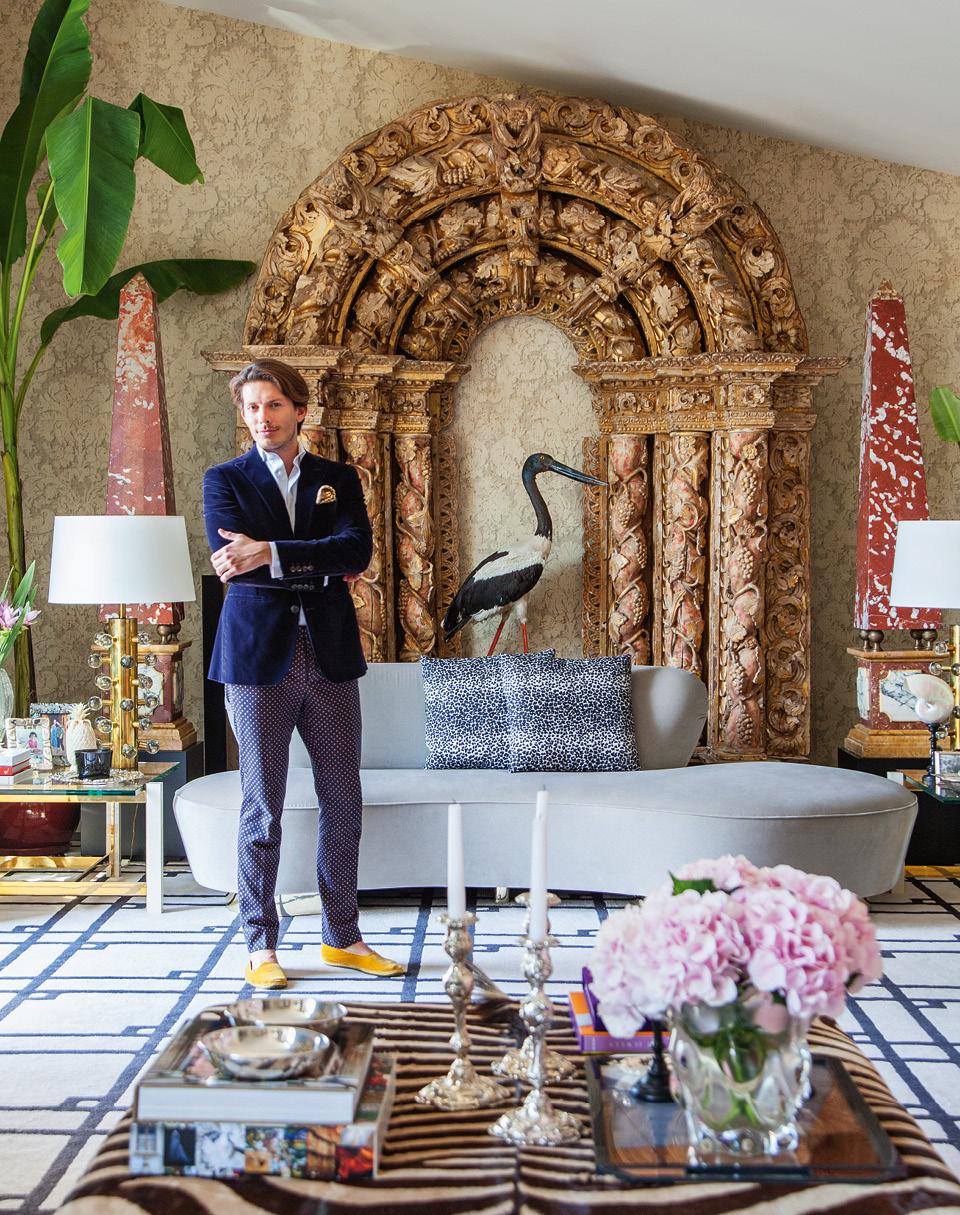 Дизайнер в гостиной на фоне старинного церковного портала.