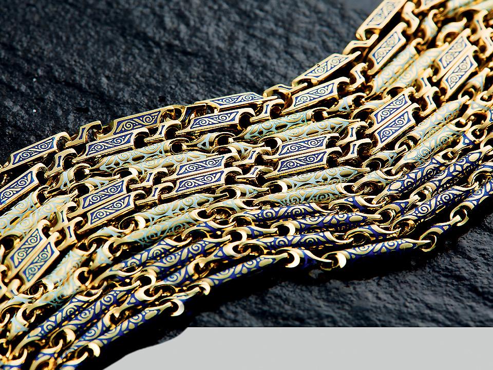 Новгородский ювелир Владимир Михайлов продолжает возрождать художественные традиции родного края: в новую коллекцию «Узоры северной Руси» вошли цепи из серебра, платины, белого и зеленого золота с эмалью.
