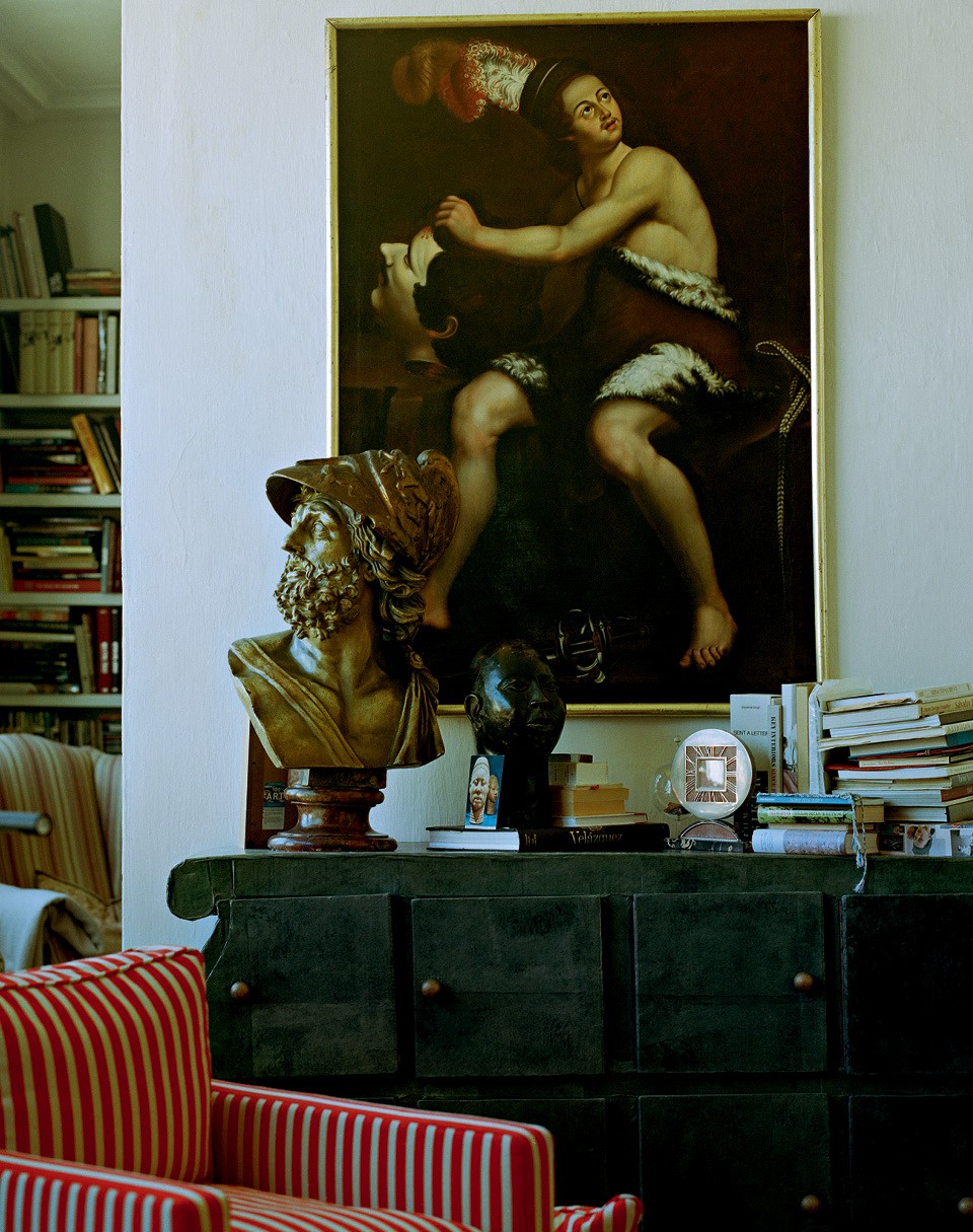 Купил сначала один этаж, потом, со временем, все четыре. А купив, обнаружил, что дом прекрасен не только окнами. Под ламинатом скрывался старинный паркет, над навесными потолками — свободное пространство. «В 1970‑х люди предпочитали создавать внутри больших домов комнаты-коробочки: их было дешевле отапливать и за ними было легче ухаживать, чем красить оригинальные потолки и шлифовать паркет. А я просто все убрал и увидел потрясающие материалы и пропорции. Сюда даже добавлять ничего не требовалось, хорошей архитектуре не нужен декор. Но у меня уже тогда было слишком много книг и предметов искусства, мебели, и с тех пор это пространство только заполнялось».