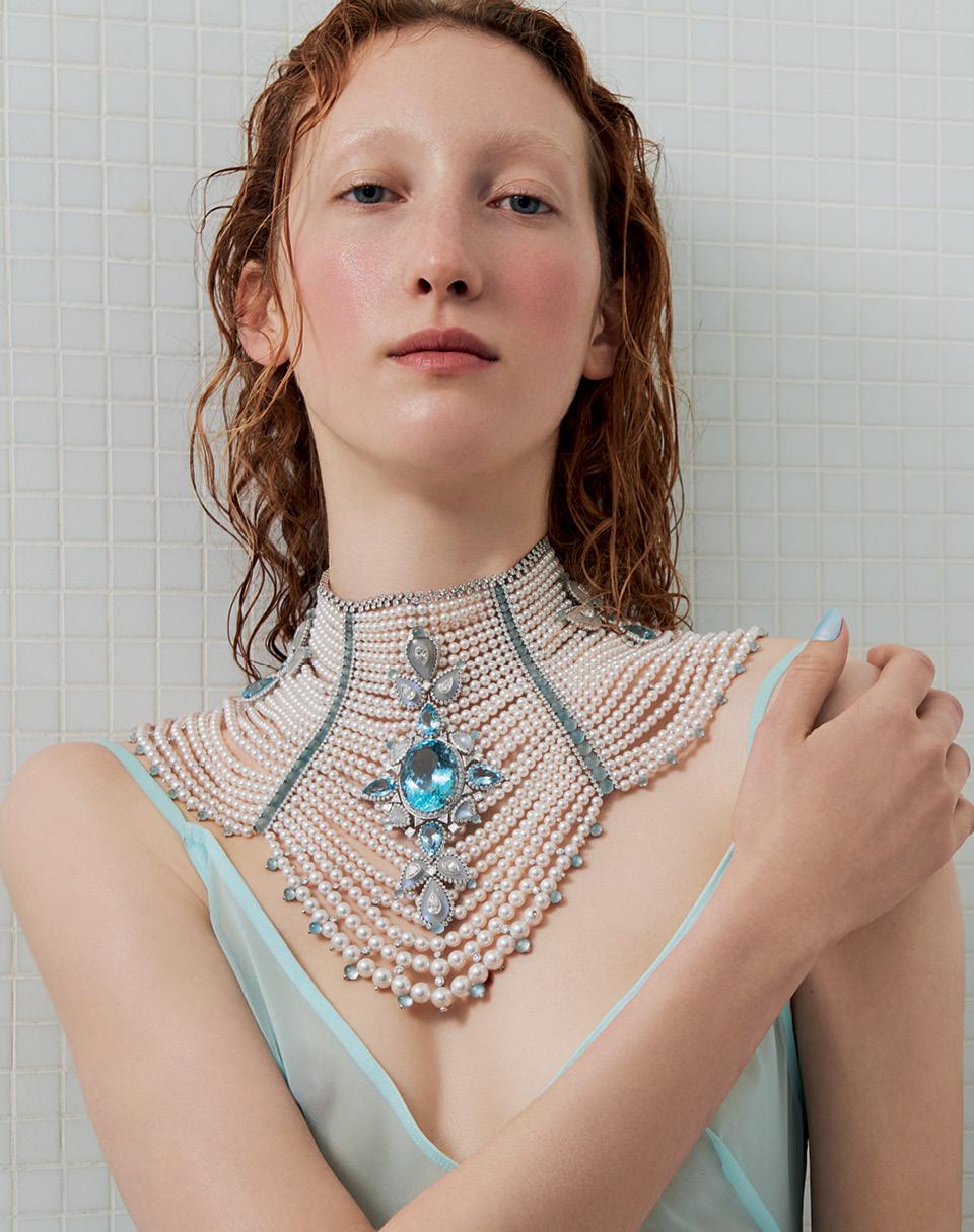 Про это — один из главных предметов коллекции, колье «Байкал» с жемчугом, живым камнем, который ценился когда-то не меньше алмаза и украшал корону-кокошник последней русской императрицы Александры Федоровны, сделанную Boucheron. В колье нити жемчуга лежат на плечах и груди, как припорошенный снегом лед, в центре — лунные камни с бриллиантами и овальный аквамарин в семьдесят восемь каратов. Вот он, ночной свет для прекрасных северных женщин, наследниц Снежной королевы и русских цариц.