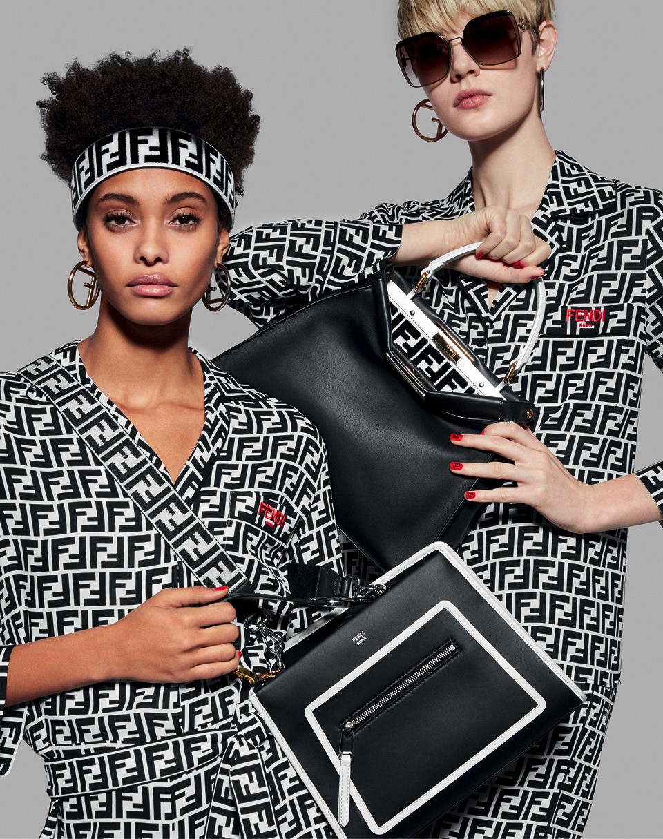 Аббревиатуру FF — от Fun Fur, «Веселый мех», — придумал Карл Лагерфельд в 1965 году буквально за три секунды, и за следующие пятьдесят с лишним лет логотип менялся больше тридцати пяти раз. Для капсульной коллекции использовали квадратную версию 1974 года. И создали принты в двух цветовых комбинациях — классический табачный цвет с черным и контрастное сочетание черного с белым.
