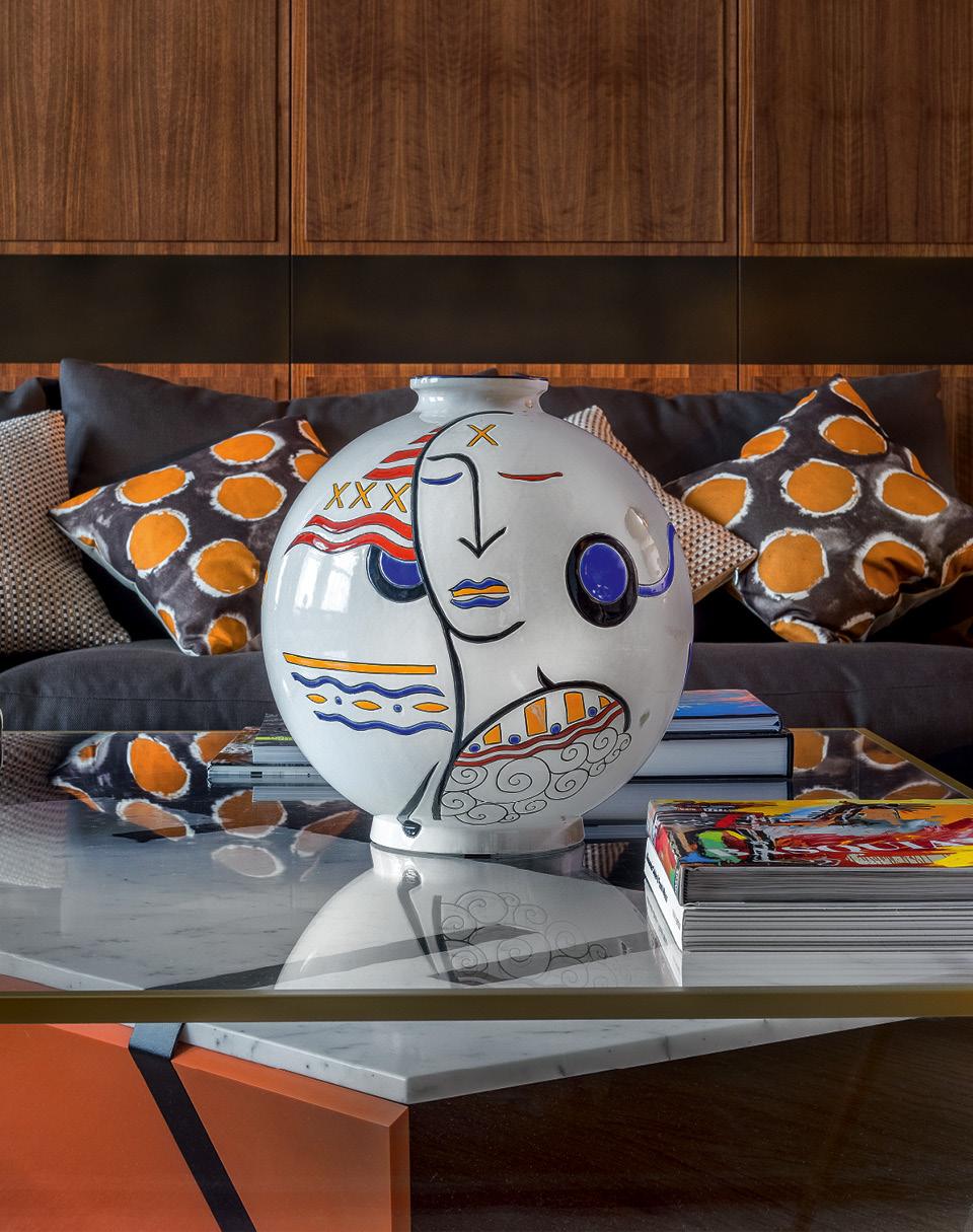 Мы беседуем в ее новой квартире на Якиманке с видом на Центральный дом художника и Крымский мост. В серых стенах со светло-коричневыми ореховыми панелями, под черными светильниками соседствуют стулья классика датского модернизма Ханса Вегнера, итальянский комод в стиле novecento и французская ваза 1950‑х годов. На стенах — любимые Кристиной художники: Поляков, Ланской, Зверев, Булатов. «Мне было важно соединить у себя дома работы разных жанров и направлений из моей личной коллекции», — говорит Кристина. Любимая вещь хозяйки — метровая скульптура «Тотем» итальянского дизайнера Этторе Соттсасса, столетие со дня рождения которого отмечалось в прошлом году. «Я увидела ее на выставке в Базеле и просто не смогла пройти мимо. Это керамическая скульптура с уникальным провенансом — она принадлежала вдове автора. У меня уже несколько раз хотели ее купить, но я твердо намерена сохранить скульптуру у себя».