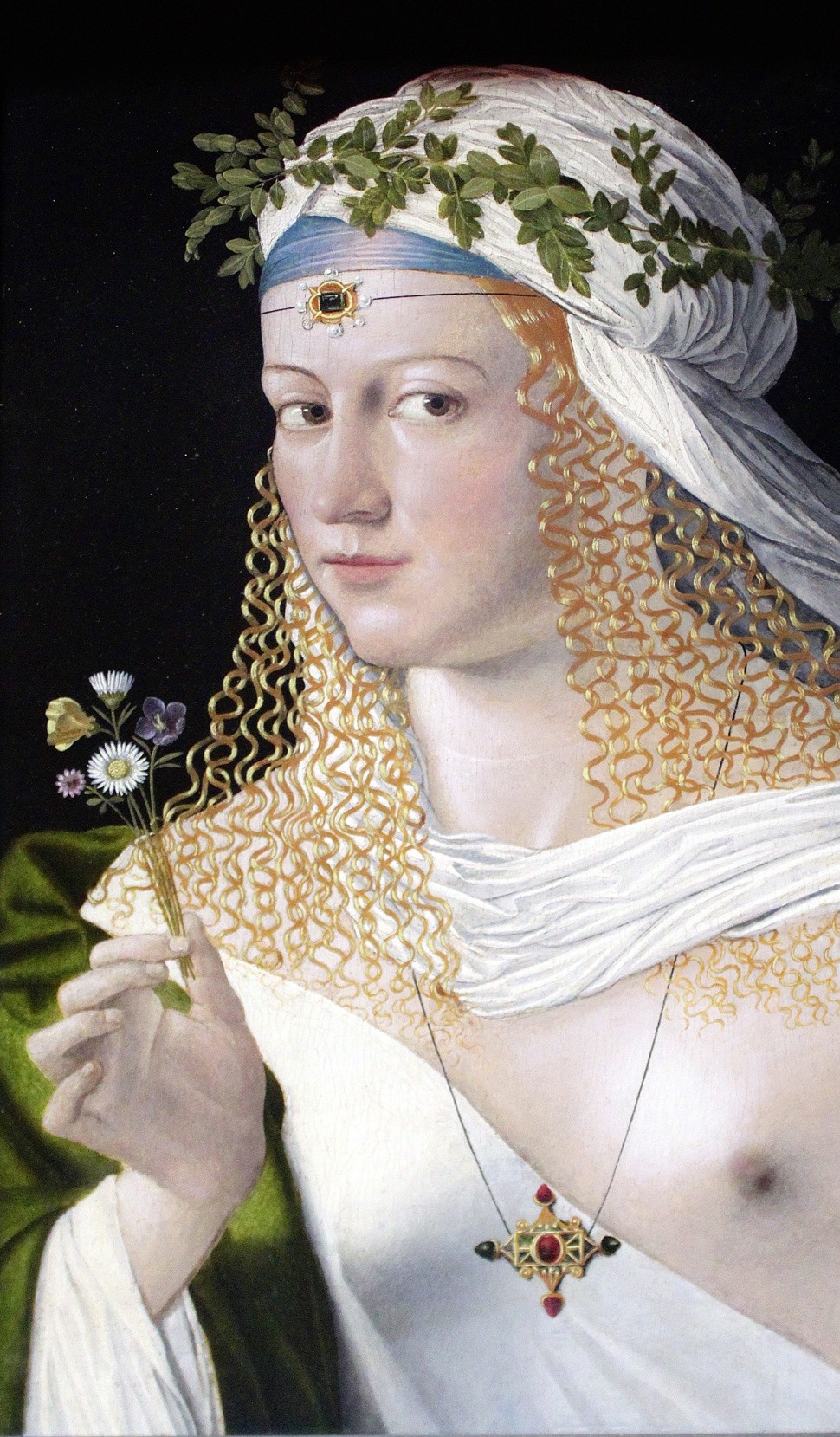 Полуобнаженная юная дева с роскошными волосами, в руке хрупкие цветочки — так легко увидеть в облике Флоры с картины Бартоломео Венето прославленную красавицу эпохи Ренессанса Лукрецию Борджиа, внебрачную дочь папы Александра VI, представительницу самой развратной и могущественной семьи того времени, невинную жертву родственников-мужчин (отец и братья неоднократно выдавали ее замуж в собственных интересах, а также, по слухам, вступали с ней в связь). Лукрецию ретивые любители искусств «опознали» на этом портрете где-то в начале ХХ века, основываясь на информации, что Венето ее некогда писал. Картину датировали примерно 1500 годом, когда модели было двадцать лет.