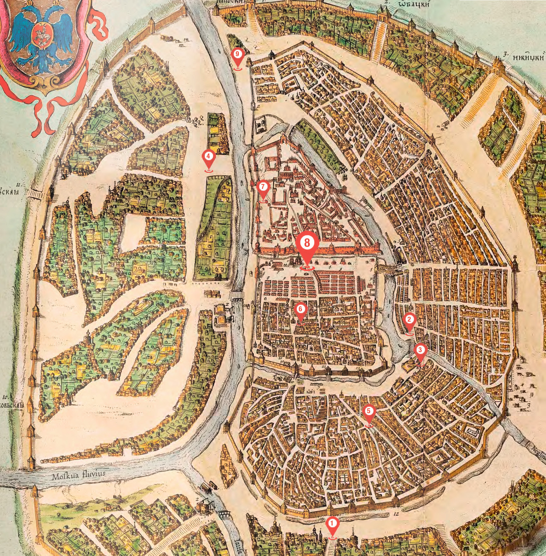 1. Немецкая слобода. Учитывая необычный внешний вид и акцент путешественника во времени, ему рекомендуется заночевать в одном из постоялых дворов района, населенного иностранцами. Туда можно дойти из центра примерно за час, выйдя из города через Покровские ворота. Там же постоялец может получить более привычную