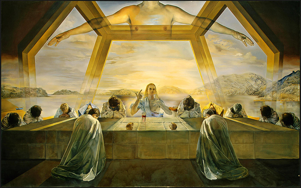 Воображение Дали занимали математические расчеты, связанные с мировой гармонией. Особенно интересовали художника принципы золотого сечения: это отношение двух неравных чисел, при котором большее относится к меньшему так же, как их сумма к большему (если это значение округлить, получится приблизительно 1,618). С подачи Матилы Гики – румынского князя, глубоко увлеченного философией и математикой и написавшего труды о золотом сечении как универсальной основе гармонии и красоты, Дали строил на этой пропорции композицию некоторых полотен. Читал художник и трактат «О божественной пропорции» жившего в эпоху Возрождения математика Луки Пачоли, который утверждал, что золотое сечение, как соотношение трех величин, символизирует Троицу. Неслучайно картина «Тайная вечеря», написанная Дали на ключевой евангельский сюжет, имеет форму золотого прямоугольника, длина которого относится к ширине в пропорциях золотого сечения. На над сценой за столом, отсылающей к другой, самой известной в истории живописи «Тайной вечере» Леонардо да Винчи, парит построенный с помощью золотого сечения двенадцатигранник. Ту же фигуру сам Леонардо рисовал на иллюстрации к трактату «О божественной пропорции», а философ Платон (и Лука Пачоли вслед за ним) считал отображением сути Вселенной.
