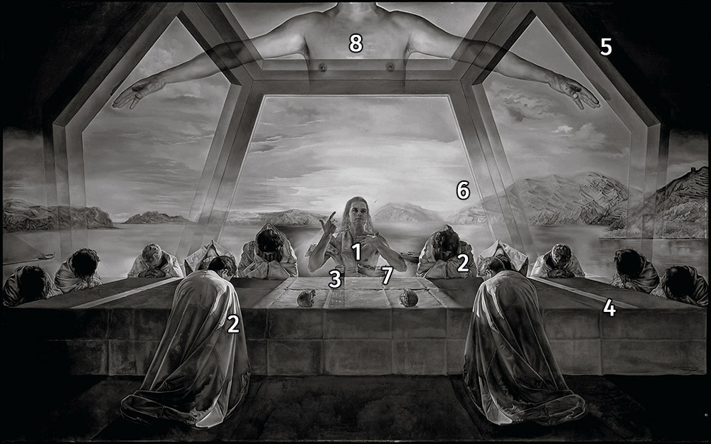 1. Христос. Через фигуру проходит центральная вертикальная ось симметрии картины. За головой находится точка схода фронтальной перспективы полотна. Так же, как на росписи Леонардо, которая построена на символике числа три, соответствующего божественной Троице, голова и руки Христа выделяются в качестве вершины равнобедренного треугольника, стороны которого Дали образует тенями и складками одежды апостолов..