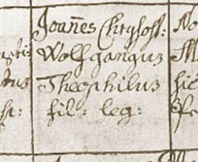 В церковном реестре крещений мальчик был записан как Joannes Chrysostomus Wolfgangus Theophilus (Иоганн Хризостом Вольфганг Теофил). А в семье его всю жизнь звали просто Вольфганг. Имя Амадей (Amadeus) — буквальный перевод на латынь греческого имени Теофил («любимый богом»), данного Моцарту в честь крестного, мальчик получил позже, когда начал выступать перед публикой. Главным языком музыкантов и меломанов Европы был итальянский, а ребенка на концертах нужно было красиво представлять. Потому и выбрали имя, которое благозвучно переводилось на этот язык, — Амадео.