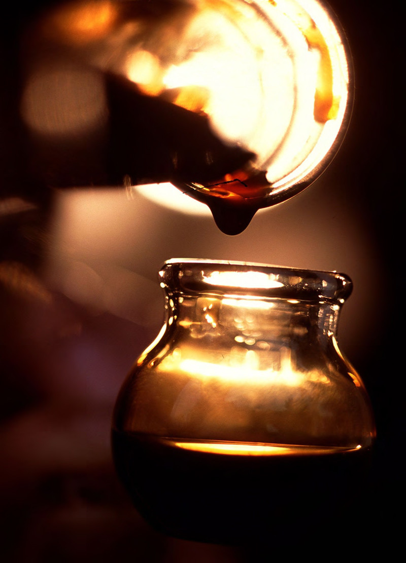 Франко берет бутылочку с бальзамиком и наливает немного в прозрачную колбу. Подносит ее к лампе, сильно наклоняет и медленно поворачивает, следя, как густая жидкость сползает по стенкам сосуда. Низ горлышка и круглые бока колбы окрашиваются в красно-коричневый цвет.