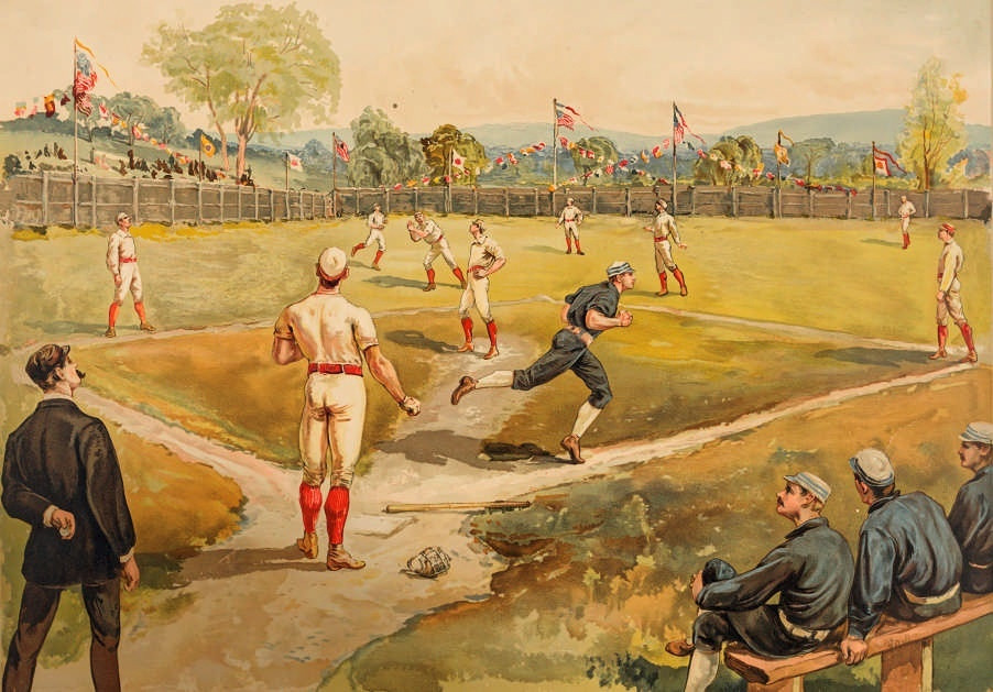 Теория возникновения бейсбола, которая долгое время считалась «канонической», гласит, что Даблдей придумал его в 1839 году – и он же тогда организовал первый в истории бейсбольный матч в Куперстауне (штат Нью-Йорк). Именно по этой причине «Зал славы бейсбола», основанный в 1936 году любителем этой игры Стивеном Карлтоном Кларком, был построен именно в Куперстауне. В начале XX века бейсбол в США уже воспринимался как национальное достояние, и американцы очень болезненно относились к рассказам о том, что корни этого вида спорта лежат в Европе.
