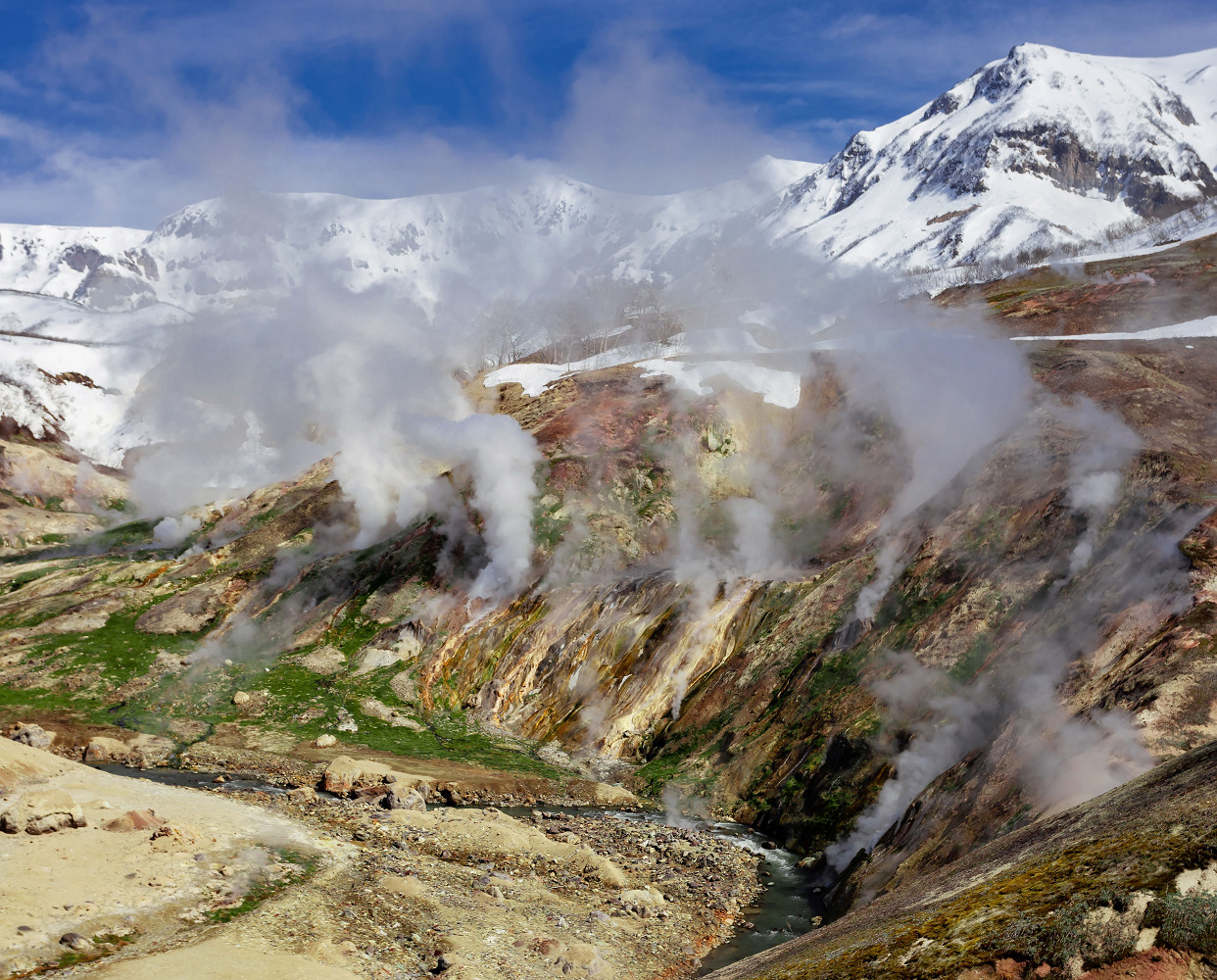 Она расположена на Камчатке в каньоне реки Гейзерная между вулканами Кихпиныч и Узон. Это одно из крупнейших гейзерных полей в мире. Долина вытянута вдоль реки почти на 6 км, а ее ширина достигает 4 км. Здесь более 40 гейзеров и более 200 термальных источников. Долина гейзеров была открыта в 1941 г. советским геологом Татьяной Устиновой и проводником-ительменом Анисифором Крупениным. Памятник природы является частью Кроноцкого заповедника. Несмотря на популярность у туристов, добраться сюда можно только на вертолете.