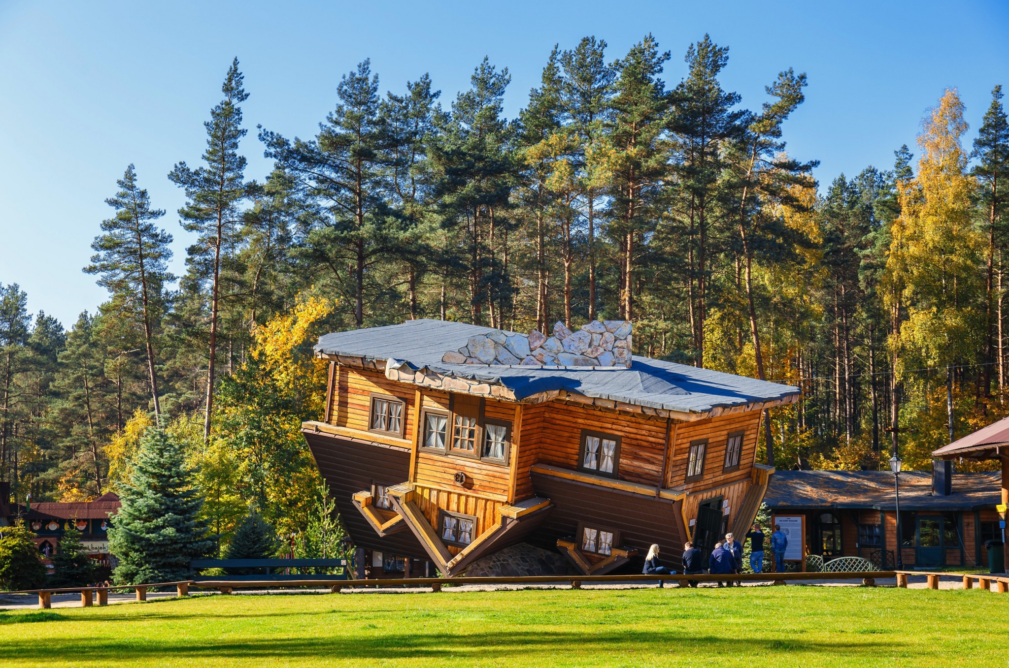 Внутри «Дома вверх ногами» много добра: мебель (свисающая с потолка), светильники (торчащие из пола) и другие полезные в хозяйстве вещи. По мысли инженера Даниеля Чапевского, создавшего объект в 2007 году, Dom do Góry Nogami символизирует эпоху коммунизма, который перевернул с ног на голову и традиции, и систему ценностей. Со слабым вестибулярным аппаратом или после сытного обеда внутрь лучше не соваться — переколбасит. Для деликатных натур в Центре просвещения и популяризации региона в Шимбарке есть много других занятных вещей.