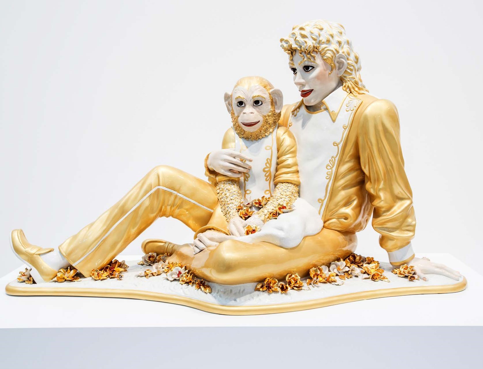 «Это моя „Пьета“», — говорил Джефф Кунс о скульптуре, изображающей поп-певца Майкла Джексона с ручным шимпанзе более чем в натуральную величину. С шедевром Микеланджело — статуей Богоматери, оплакивающей Христа, — работу Кунса роднит треугольная композиция, однако подобное сравнение может показаться кощунственным. «Майкл Джексон и Бабблз», как и другие скульптуры серии «Банальность» 1988 года, напоминает дешевые сувенирные статуэтки и выглядит как воплощение китча. Даже создана скульптура «фабричным» способом: Кунс разработал образ, а саму статую изготовил целый коллектив профессионалов, работающих с фарфором.