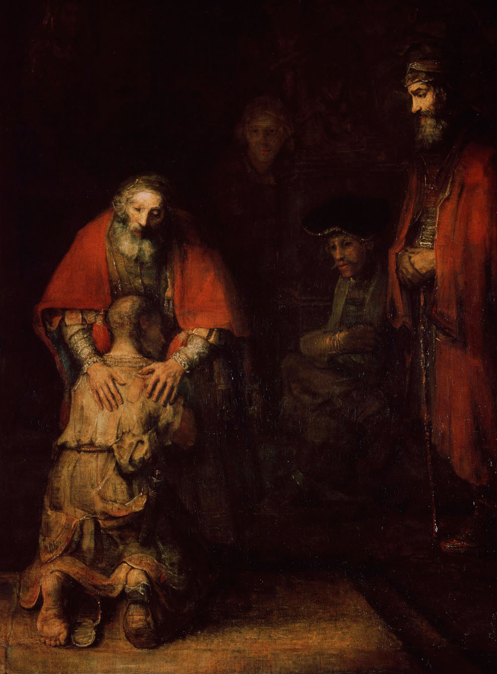 Возвращение блудного сына» Рембрандт написал незадолго до смерти. В основе — притча из Евангелия от Луки, которую рассказывает Иисус фарисеям. Младший сын одного человека попросил выделить ему часть имущества, уехал от семьи, прокутил все добро и, впав в нищету, вернулся к отцу с покаянием. Родитель великодушно простил заблудшего, распорядился устроить в его честь пир и заколоть откормленного тельца. Когда старший, добропорядочный сын возмутился, почему он не видал от отца таких почестей, тот сказал: «Ты всегда со мною, и все мое твое, а о том надобно было радоваться и веселиться, что брат твой сей был мертв и ожил, пропадал и нашелся» (Лк. 15:31–32). Американский историк искусства Сьюзен Донахью Курецки отмечает, что в религиозных спорах конца XVI века о спасении души «католики использовали притчу, чтобы доказать важность покаяния и церковного таинства исповеди, в то время как протестанты считали ее столь же ярким примером Божьей милости к одумавшимся грешникам».