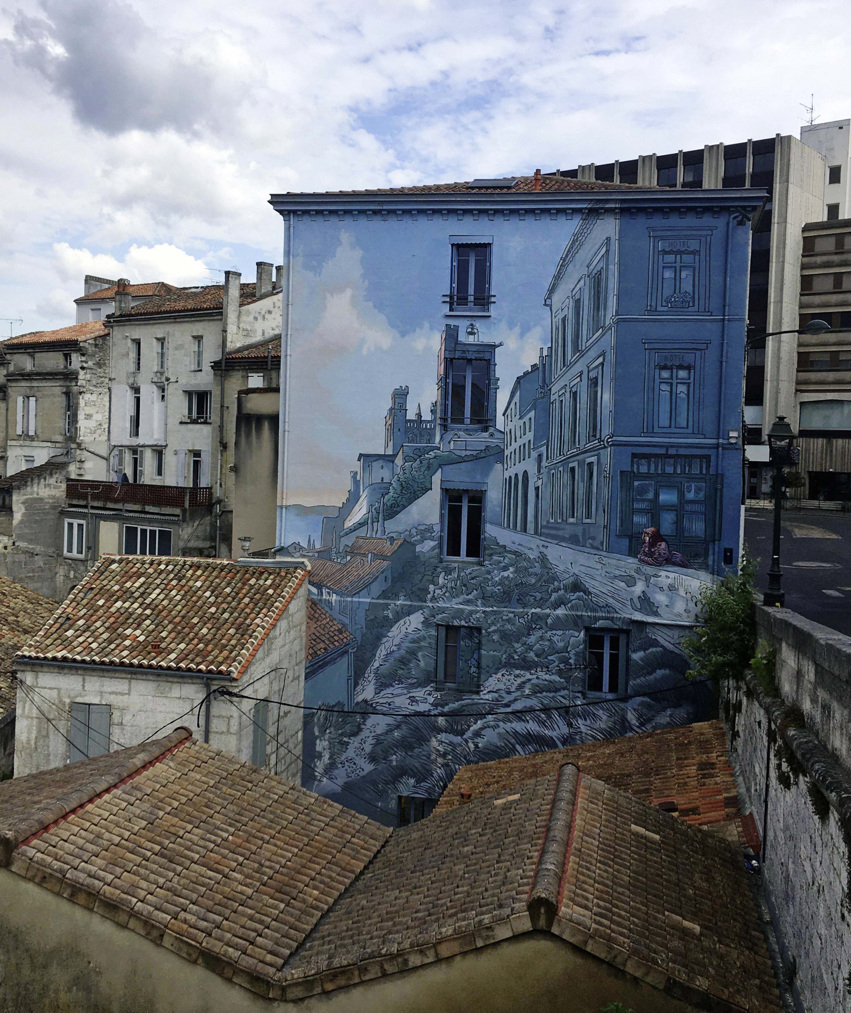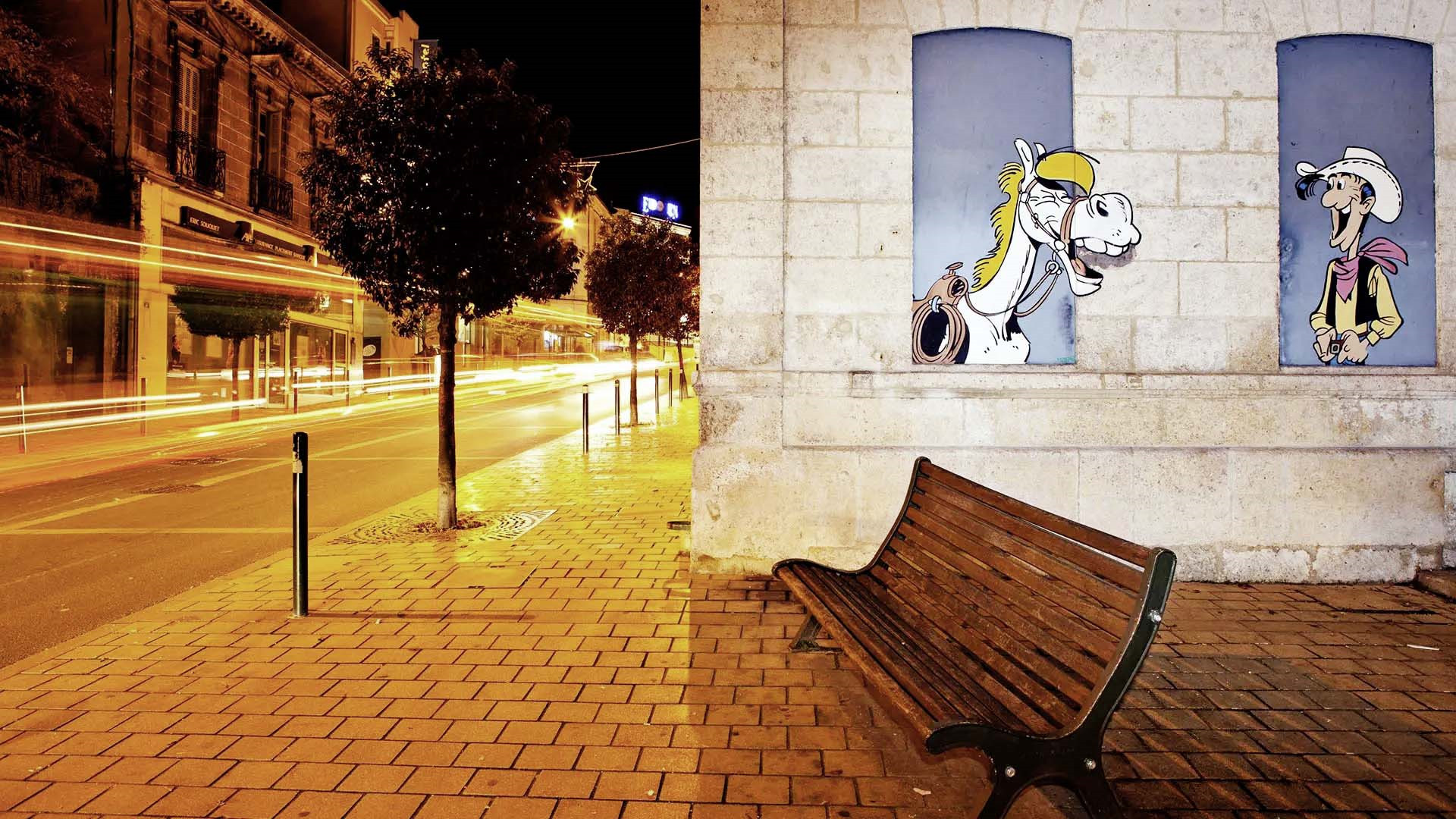Древний Ангулем стоит на потухшем вулкане. Узкие улочки, вьющиеся меж высоких каменных стен, под моросящим дождем выглядят уныло. Зябко поеживаясь, усталый турист уже мечтает поскорее дойти до вокзала и уехать куда подальше... как вдруг из окна первого этажа на него выпрыгивает задорно смеющаяся лошадь – к счастью, нарисованная! А из соседнего окошка выглядывает веселый ковбой в широкополой шляпе. «Ну конечно! – вспоминает путешественник. – Это же Счастливчик Люк из старого комикса про ковбоя, который стреляет быстрее своей тени!» Полистав путеводитель, турист находит подробную статью о системе расписных стен с персонажами комиксов и соответствующий пешеходный маршрут, за несколько лет ставший визитной карточкой Ангулема. Перспектива прогуляться по городу и пофотографироваться на фоне героев, приключениями которых зачитывался с детства, выглядит заманчиво, так что на вокзал можно и не спешить.