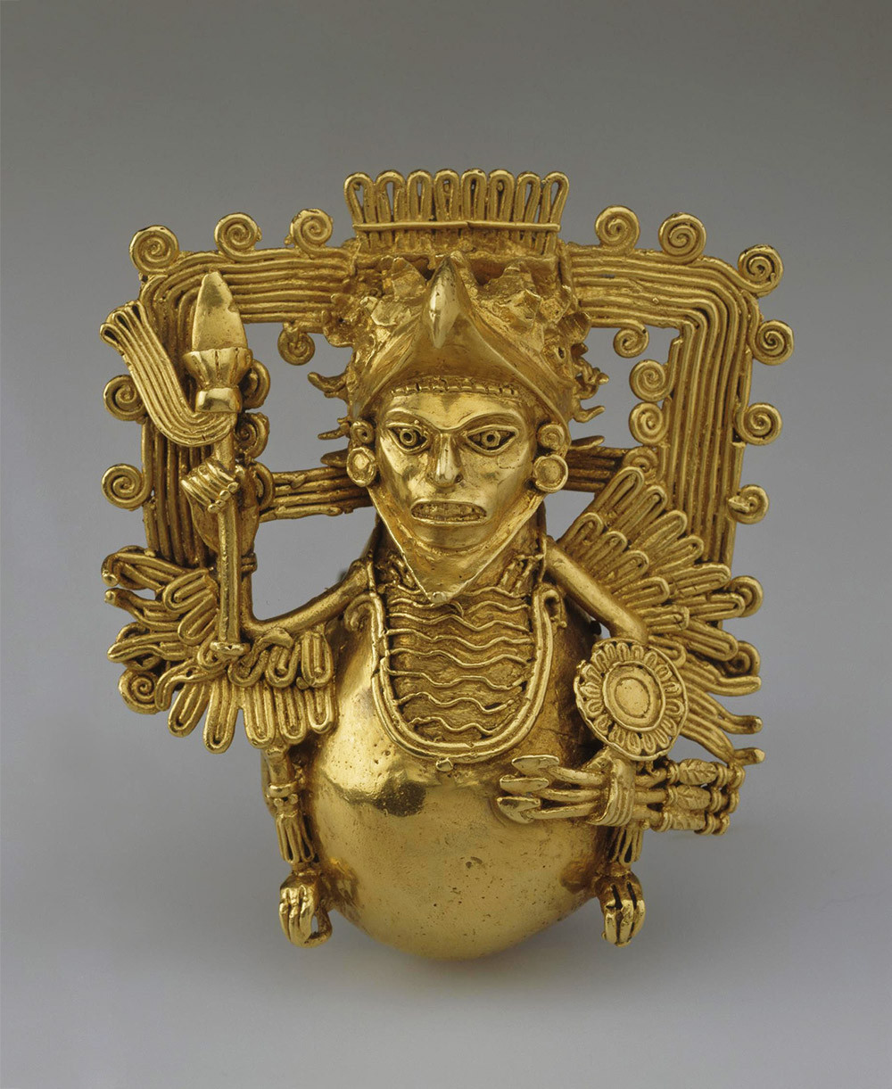 Жемчужина мезоамериканской коллекции Эрмитажа – золотая подвеска-бубенец с медной бусиной внутри полого корпуса. В мировых собраниях искусства доколумбовых цивилизаций у нее почти нет аналогов. В эпоху Великих географических открытий европейские колонизаторы охотились за золотом ацтеков. Захватывая города Мезоамерики, конкистадоры безжалостно переплавляли награбленные сокровища в слитки. Поэтому до нашего времени сохранились лишь единичные образцы ацтекской металлообработки. Подвеска из Эрмитажа примечательна не только тем, что вообще уцелела, но и мастерством, с которым она выполнена. Исследователи предполагают, что драгоценность изготовил работавший на ацтеков ювелир из покоренного ими народа миштеков. Мифическое существо с головой человека и телом птицы держит жезл с перьями, три дротика и церемониальный щит. На голове – шлем с орлиным клювом и диадема из перьев. Скорее всего, подвеска была знаком принадлежности ее владельца к существовавшему у ацтеков своеобразному ордену воинов-орлов. Эта хищная птица ассоциировалась с Солнцем, а изображения таких воинов часто встречаются в ацтекском искусстве. Драгоценную шумящую подвеску, вероятно, носил на груди один из предводителей.