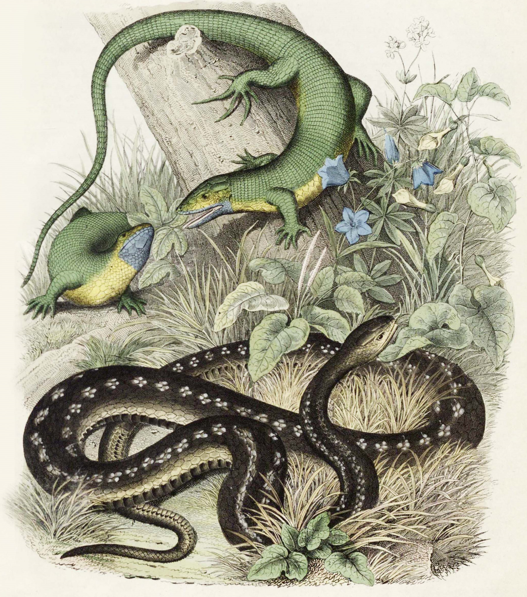 В Европе очень немного пресмыкающихся, так что, например, у нас в России едва можно насчитать десять видов на таком пространстве, на каком в Африке или в Азии найдется их тридцать и более, не говоря уже о неделимых, которые там гораздо многочисленнее. Сверх того, Европа должна уступить Азии и Африке в красоте большей части своих животных, а в том числе и пресмыкающихся. У нас эти животные по большей части сероваты и коричневаты, так что мало отличаются цветом от земли, на которой суждено им держаться по устройству организма: тропические страны, напротив, обладают огромным, хотя и не завидным богатством пресмыкающихся необыкновенно красивых форм, разнообразных цветов и всех величин. У нас в Европе водится однако довольно красивого цвета ящерица, зеленая, Lacerta