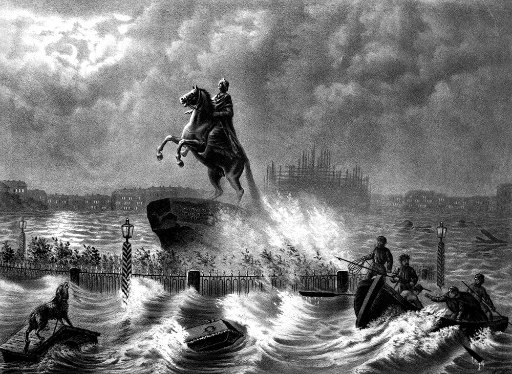 Северная столица переживала потопы более 300 раз, но бедствие, случившееся 19 ноября 1824 года, – одно из самых разрушительных. Вода реки Невы поднялась более чем на четыре метра, затопив почти весь город. Об этом наводнении рассказывает поэма Александра Пушкина «Медный всадник»: «Нева вздувалась и ревела,//Котлом клокоча и клубясь,//И вдруг, как зверь остервенясь,//На город кинулась».