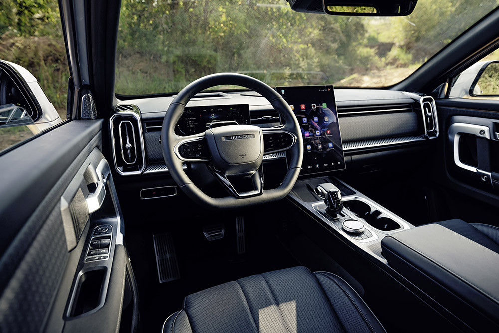 Попадая внутрь «кабины» «Крутого охотника» (название марки – производная от немецкого Jaeger («охотник») и английского Cool («крутой»), сразу понимаешь: претензия на премиум обоснована. Потолок обрел черную отделку, дверные ручки утапливаются в корпус, улучшая аэродинамику. Внутри же они обыграны нарочито неприкрытыми шестигранными болтами, что добавляет интерьеру брутальности. Джойстик управления КПП у J7 необычный – напоминает прибор истребителя. На большой дисплей можно вывести всю необходимую дорожную информацию, а на маленьком – выбрать темы, в том числе классическую, с круглыми шкалами. Раньше такого разнообразия не было. Вообще, принцип двух экранов мне импонирует. «Лицевой» (тот, что за рулем) — небольшой и потому не отвлекает от вождения. Все дополнительное отселено на большого собрата, «как в Tesla»: тут и мультимедиа, и красивые обозначения режимов езды («снег», «песок», «грязь», «спорт», «4х4», «эко»), и навигация «во весь рост» диагонали.