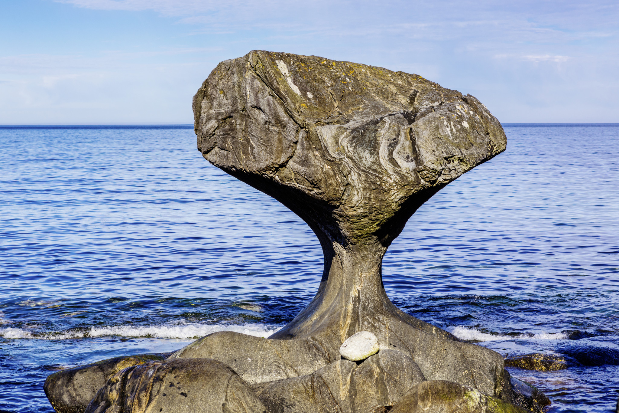 Эта скала из плотной горной породы эклогит находится на острове Вогсёй. Тысячи лет волны точили камень, придавая ему причудливую форму. Местные жители прозвали ее Kannestolen, поскольку на норвежском «столен» означает «стул». Трехметровая скала, на которой могут расположиться 3–4 человека, чем-то похожа на модное скандинавское кресло.