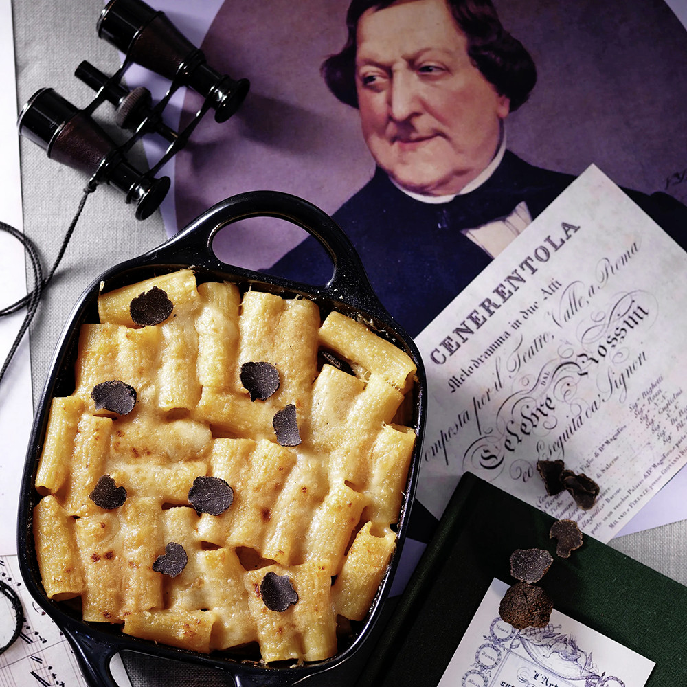Композитор дожил до семидесяти шести и написал без малого 40 опер. Однако все это богатейшее наследие было создано в первые 37 лет. В оставшиеся четыре десятилетия он не сочинил ни одной оперы. Время от времени возвращаясь к музыке, Россини посвятил досуг радостям жизни, главной из которых для него было чревоугодие. В корреспонденции он много писал о еде, благодаря чему сохранился его рецепт салатной заправки, которым композитор очень гордился. Россини перебрался во Францию и высоко оценил местную кухню. Недаром в блюдах alla Rossini присутствуют трюфели и желательно еще фуа-гра. Известный кондитер и историк кулинарного искусства Пьер Лакам рассказывал, что Россини сам заполнял макароны начинкой по собственному рецепту (с трюфелями), а серебряный шприц, который он для этого использовал, после смерти композитора был продан за внушительную сумму.