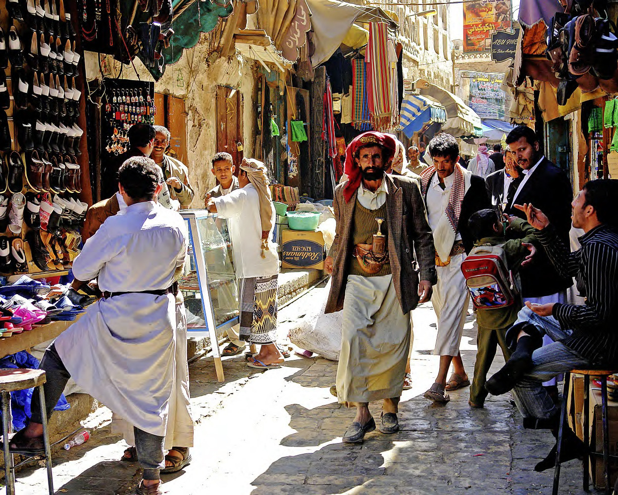 «Потеряться в пестром хаосе на рынке Сук-аль-Мильх в Сане» — обязательная рекомендация путеводителей по столице Йемена. Торговые улочки, стиснутые «пряничными» глиняными домиками, разбегаются во всех направлениях. Что ни лавка, то пещера Аладдина с грудой сокровищ. Сокровища охраняют невозмутимые торговцы. На каждом — белая фута (традиционная мужская юбка), светлая рубашка, пиджак, за поясом — кривой кинжал джамбия, за щекой — комок листьев ката (легкий наркотик национального значения). В этом калейдоскопе товаров, людей и ощущений самый надежный навигатор — нос.