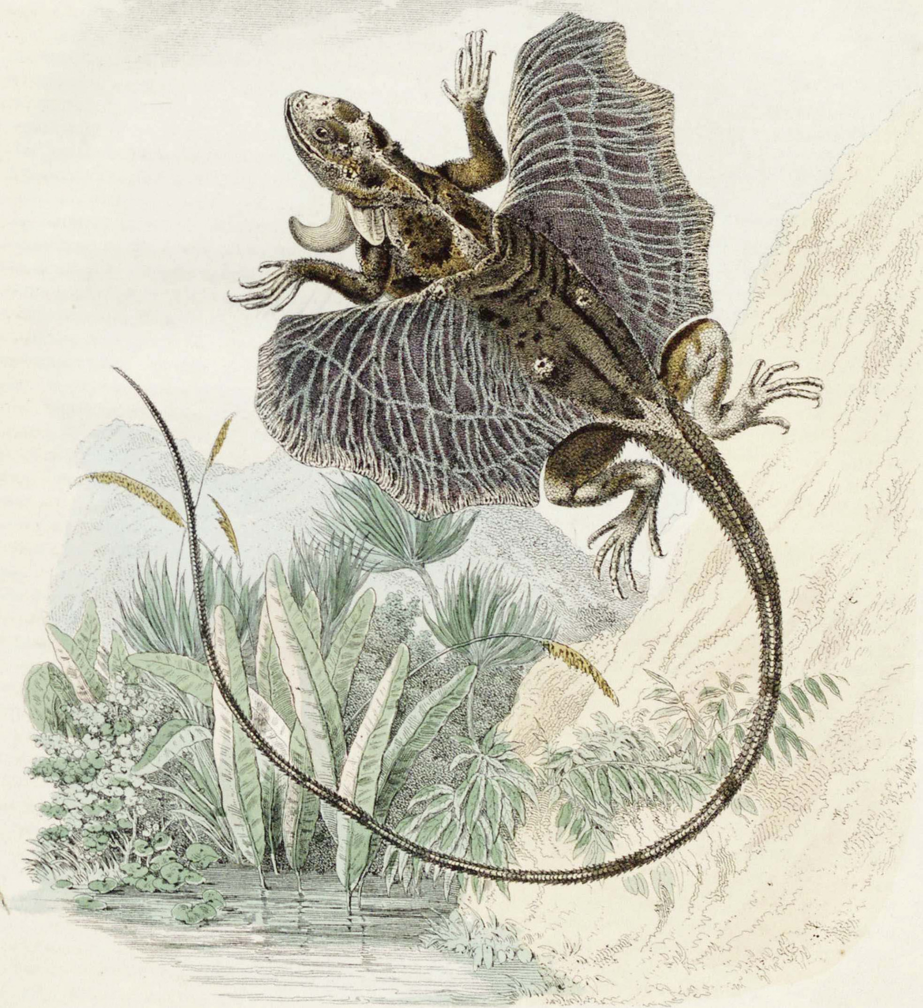 Летучие ящерицы – маленькие, совершенно невинные животные. Между земноводными они то же, что летучие белки между зверями и летучие рыбы между обитателями вод. Драконы не могут держаться долго на воздухе, но удобно перелетают с одного дерева на другое и, как говорят, даже в состоянии несколько порхать, как бабочки. Летучие ящерицы водятся в густых лесах самой жаркой части Азии, на больших островах Великого Океана, особенно на Яве и Суматре, и, может быть, в Африке. Драконы очень боязливы, живут в уединенных местах, большею частью на деревьях. Их редко видно на земле, по которой они ползают с большим трудом. <…>