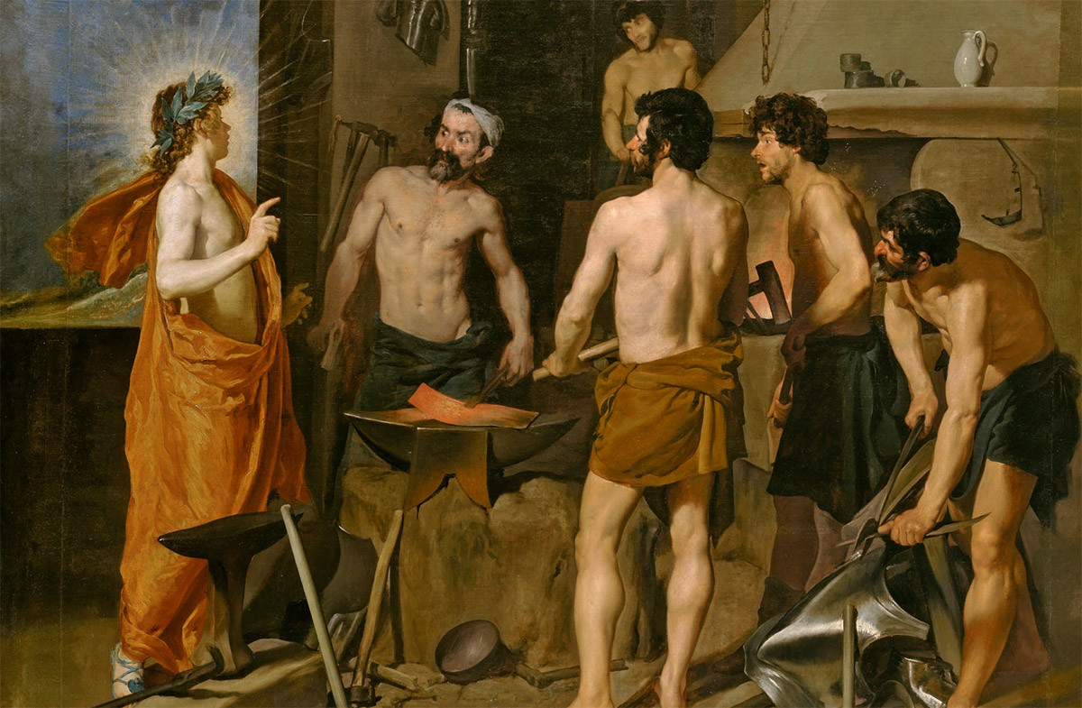 На картине «Кузница Вулкана», которую Диего Веласкес написал во время первого путешествия в Италию, – первый акт семейной драмы бога огня и кузнечного ремесла, рассказанной в поэме Овидия «Метаморфозы». Жена Вулкана, богиня любви и красоты Венера, изменяла ему с богом войны Марсом, но всевидящий бог солнца заметил адюльтер и сообщил о нем обманутому мужу. У Овидия «доносчиком» выступает Гелиос, у Веласкеса – Аполлон, которого отождествляли с Гелиосом со времен поздней Античности. Выслушав неприятную новость, Вулкан изготовил чудесную сеть, поймал в нее Венеру с любовником на месте «преступления» и пристыдил перед другими богами. Боги посмеялись, вслух позавидовали Марсу, красавицу-жену Вулкан простил, а пострадали из-за этой истории непричастные. Венера, мстя богу солнца за донос, внушила ему страсть к вавилонской царевне Левкотое. Божество проникло к царевне в спальню и овладело испуганной девушкой. Об этом узнала влюбленная в него Клития и в свою очередь донесла из ревности отцу Левкотои, а тот казнил дочь, зарыв ее в землю живьем, – за то, что не уберегла целомудрие. С Клитией же бог солнца с тех пор не хотел знаться, и она от тоски превратилась в подсолнух.
