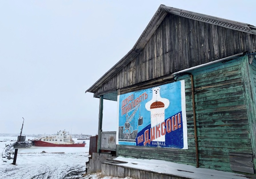 Улыбающийся белый медведь держит в лапах свежеиспеченный каравай. Мимо этой картинки на деревянном здании в порту диксонцы проходят каждый день. Она напоминает о временах, когда на Диксоне швартовались круизные лайнеры «Чехов» и «Чкалов» и жители самого северного поселка России приветствовали прибывших издалека гостей.