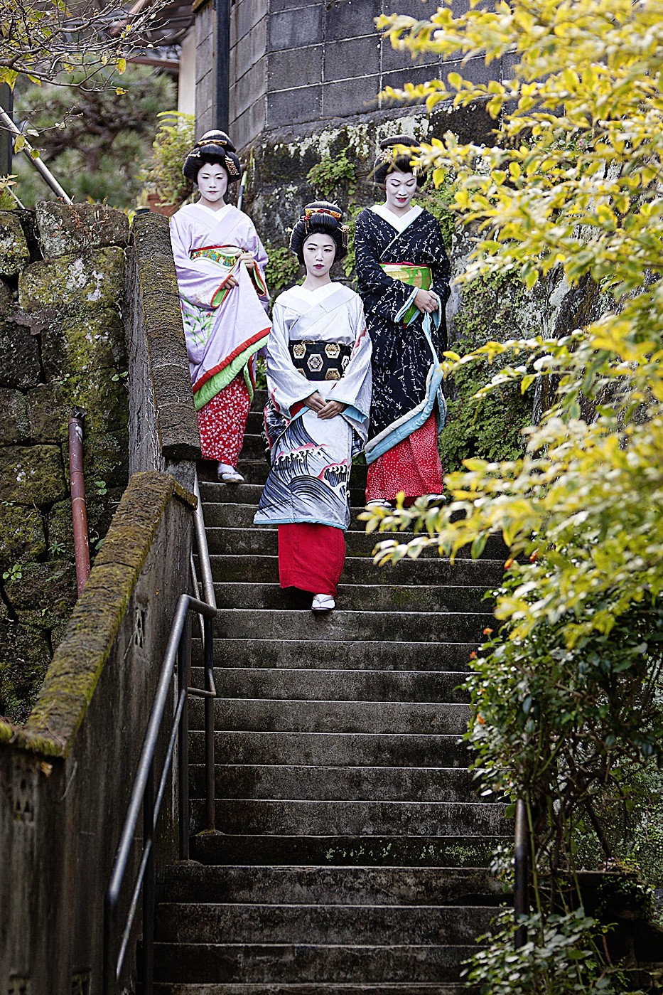 Я остаюсь ждать перед неприметными воротами, ведущими в маленький сад. Пожилая хозяйка чайного домика поливает водой из шланга дорожки и порог — знак особого расположения в Японии. Через несколько минут она кланяется и приглашает войти. Простая квадратная комната с большим окном в сад выстелена татами. Хозяйка ставит на пол поднос с тремя чайными чашечками — для меня, переводчика и нашего посредника в беседе. Затем появляется гейша. Длинное голубое кимоно с узором из синих цветов, подвязанное персиковым поясом, сложная высокая прическа, снежной белизны лицо: хрупкая гейша кажется гостьей из далекого прошлого.