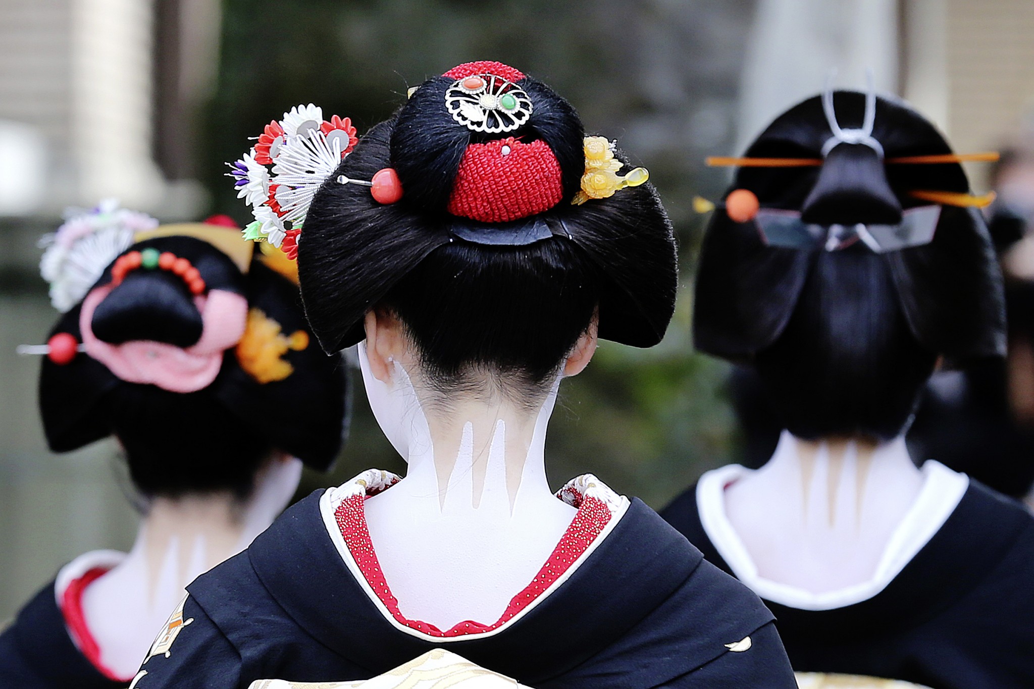 Обычно я собираюсь всего за час и сама. Лишь с поясом прошу помочь мне маму — окасан. Так мы называем хозяйку чайного домика. В Киото гейшам со сборами до сих пор помогают ученицы — майко. А сложный пояс оби завязывают специально нанятые мужчины, отокоси. Прическа не требует времени, все гейши носят парики из настоящих волос, уложенных в традиционную прическу симада. Макияж тоже традиционный — белила на лицо и шею и красная помада для губ, бровей и глаз. Белила не наносятся на заднюю часть шеи, под линией роста волос. И через открытый сзади ворот кимоно мужскому взгляду открывается участок кожи, которого не коснулись белила. Такая эротика по-японски.