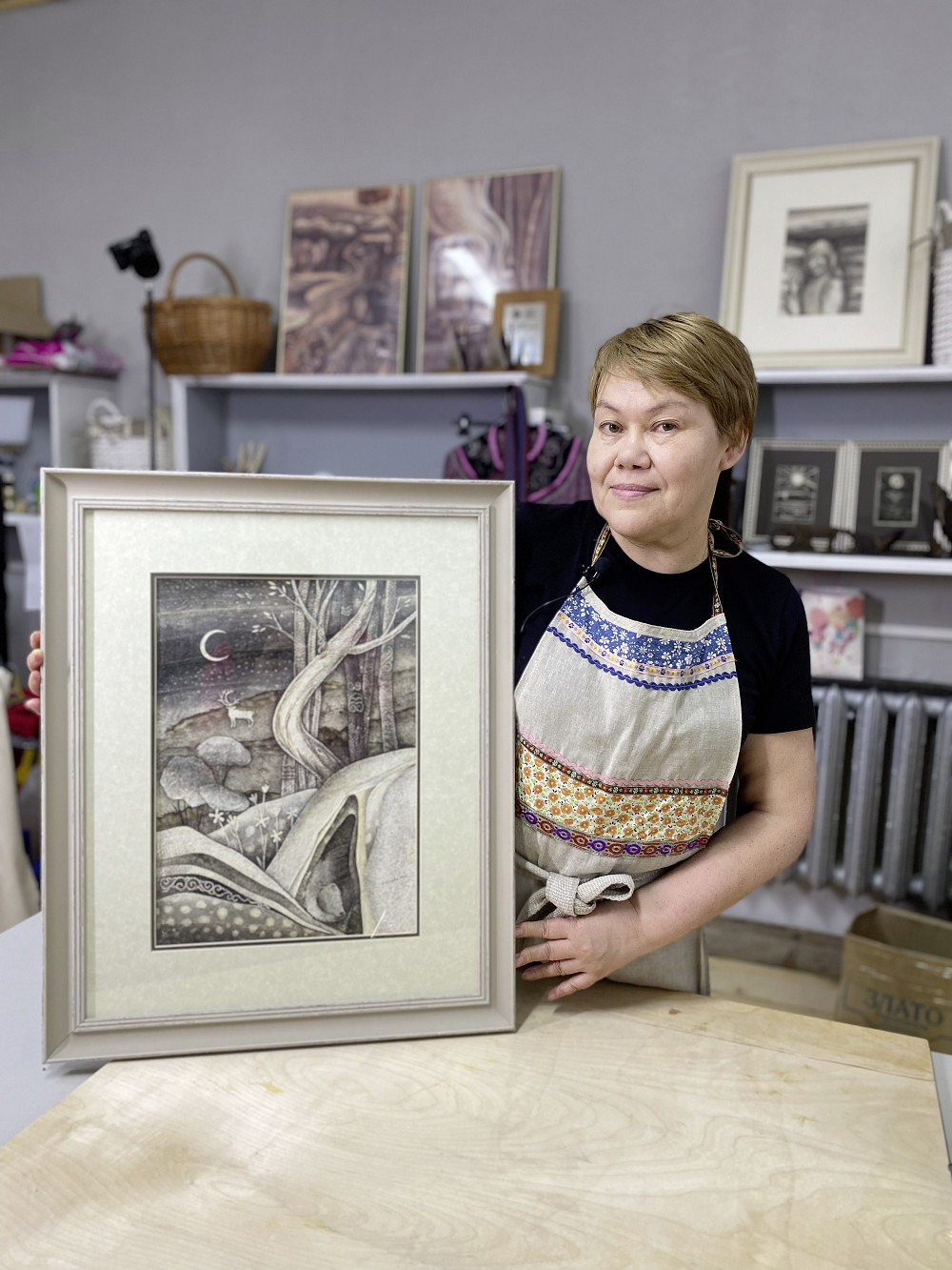 Мы сидим в мастерской художницы Вероники Осиповой, и нас окружает множество картин – законченных или существующих пока лишь в виде набросков. Вероника Владимировна по национальности уильта. Это один из самых малочисленных народов в мире – примерно человек триста. Культура этого кочевого народа, испокон веков живущего на Сахалине, тесно связана с оленеводством. Но в период лососевой путины уильта активно заготавливали рыбу. Рыбой не только питались, но и использовали в других целях – например, изготавливали из ее кожи одежду, обувь, мешки, сумки. Отталкиваясь от традиций предков, Вероника Владимировна разработала собственный вид искусства. Она создает из рыбьей кожи картины-аппликации. В ее руках этот необычный материал преображается – на картинах возникают лес и море, люди и звери, сценки из повседневной жизни коренных народов Сахалина и сказочные сюжеты.