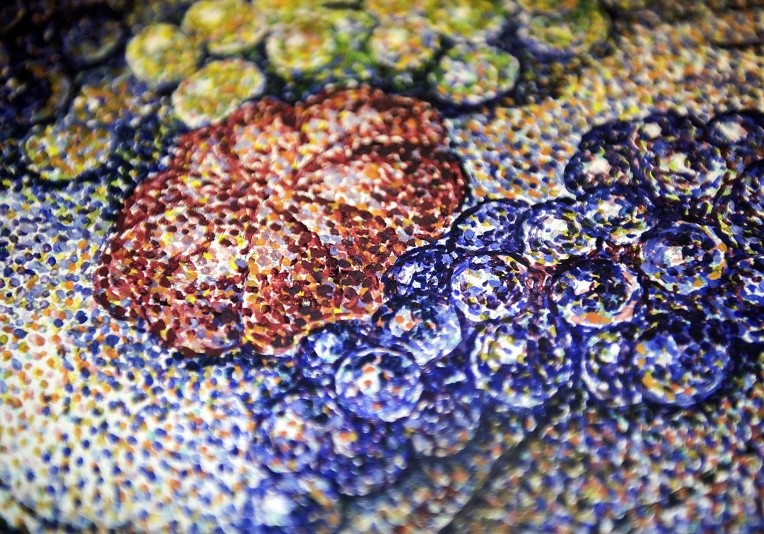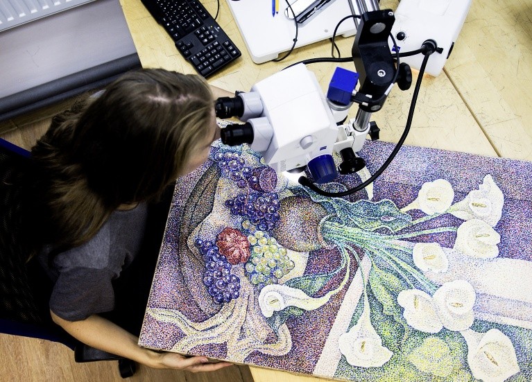 При многократном увеличении потемневший старинный натюрморт превращается в ослепительный пейзаж: натуральные пигменты масляных красок и потрескавшийся лак выглядят как мраморные скалы и головокружительные каньоны.