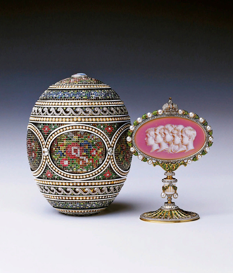 А если считать по сумме, которую получила фирма Фаберже от императорской семьи за яйцо, самым дорогим будет то, которое в литературе называют «Мозаичным». В бухгалтерской книге фирмы оно описано как платиновое яйцо ажурной работы, «вышитое по канве». Дизайнер Альма Пиль решила проект в духе дамского рукоделия. Сквозная скорлупа яйца выполнена из платины в виде канвы, как будто вышитой цветными нитками. «Вышивку» изображают нескольких тысяч драгоценных камней: бриллиантов, жемчугов, изумрудов, рубинов, сапфиров, хризолитов, аметистов, альмандинов и адуляров (так называли лунные камни). Сюрприз внутри – камея с профилями детей императорской четы. За это яйцо Николай II уплатил 28 300 рублей.